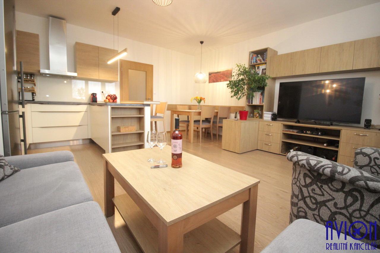 V kompletně zařízeném obývacím pokoji nábytkem na míru se dále nachází kuchyňský stůl se židlemi, sedací souprava, konferenční stolek, kuchyňská linka včetně vestavných spotřebičů, indukční varná deska, vestavná trouba a mikrovlnná trouba, digestoř, myčka, lednice. Ve velké ložnici o ploše 18 m2 je velká šatní skříň, druhý pokoj o ploše 11 m2 je nezařízený. Z ložnice a pokoje je vstup na velkou zasklenou lodžii. Moderní koupelna s vanou, koupelnovou skříňkou na míru. Toaleta je samostatná. V předsíni je vestavěná skříň a botník. Přímo v bytě je komora. Podlahovou krytinu tvoří plovoucí podlahy v pokojích a dlažba v předsíni a koupelně. Všechny pokoje jsou neprůchozí.
