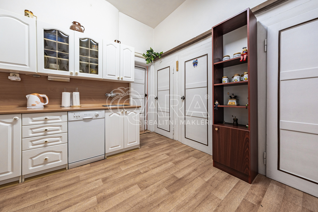 Kuchyň spojuje další dva pokoje - obývací pokoj, s původními dřevěnými parketami a vybavený sedací soupravou s křeslem a komodami