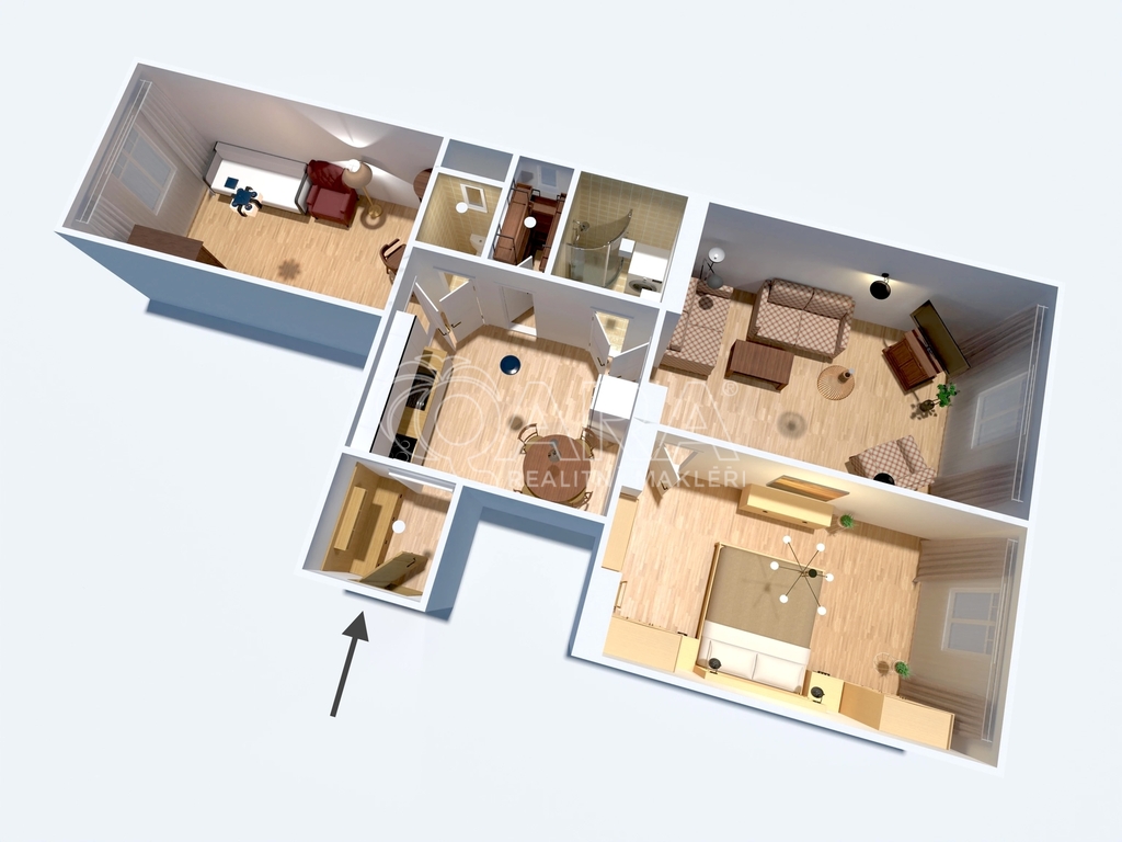 Z obývacího pokoje se vchází do vybavené prostorné ložnice. Z kuchyně je dostupná i koupelna se sprchovým koutem, umyvadlem a pračkou. Toaleta je také samostatná a dostupná opět z kuchyně.