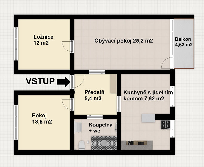Od 1.února 2026 exkluzivně nabízíme dlouhodobý pronájem velmi zajímavého, světlého, nezařízeného bytu 4+kk o ploše 76,52 m2 s balkonem 4,62 m2 s výhledem do vnitrobloku v 1. patře cihlového domu. Majitelé rekonstrukcí velmi vkusně a prakticky využili každé místo a tak vznikl prostorný, světlý, vzdušný byt, který je velmi zajímavě dispozičně řešen. Vstupem do bytu se nacházíte ve čtvercové chodbě (5,4 m2). Dále kuchyně s francouzským oknem s jídelnou (7,92 m2) s výhledem do tichého dvora. Prostorný obývací pokoj (25,2 m2) se vstupem na balkon, kde můžete po pracovním dni v klidu odpočívat. Dále je zde čtvercová ložnice (12 m2) a dětský pokoj (13,6 m2).