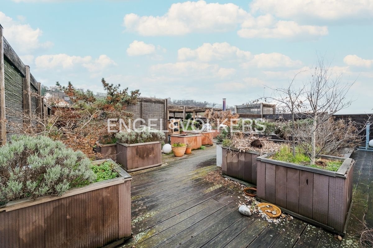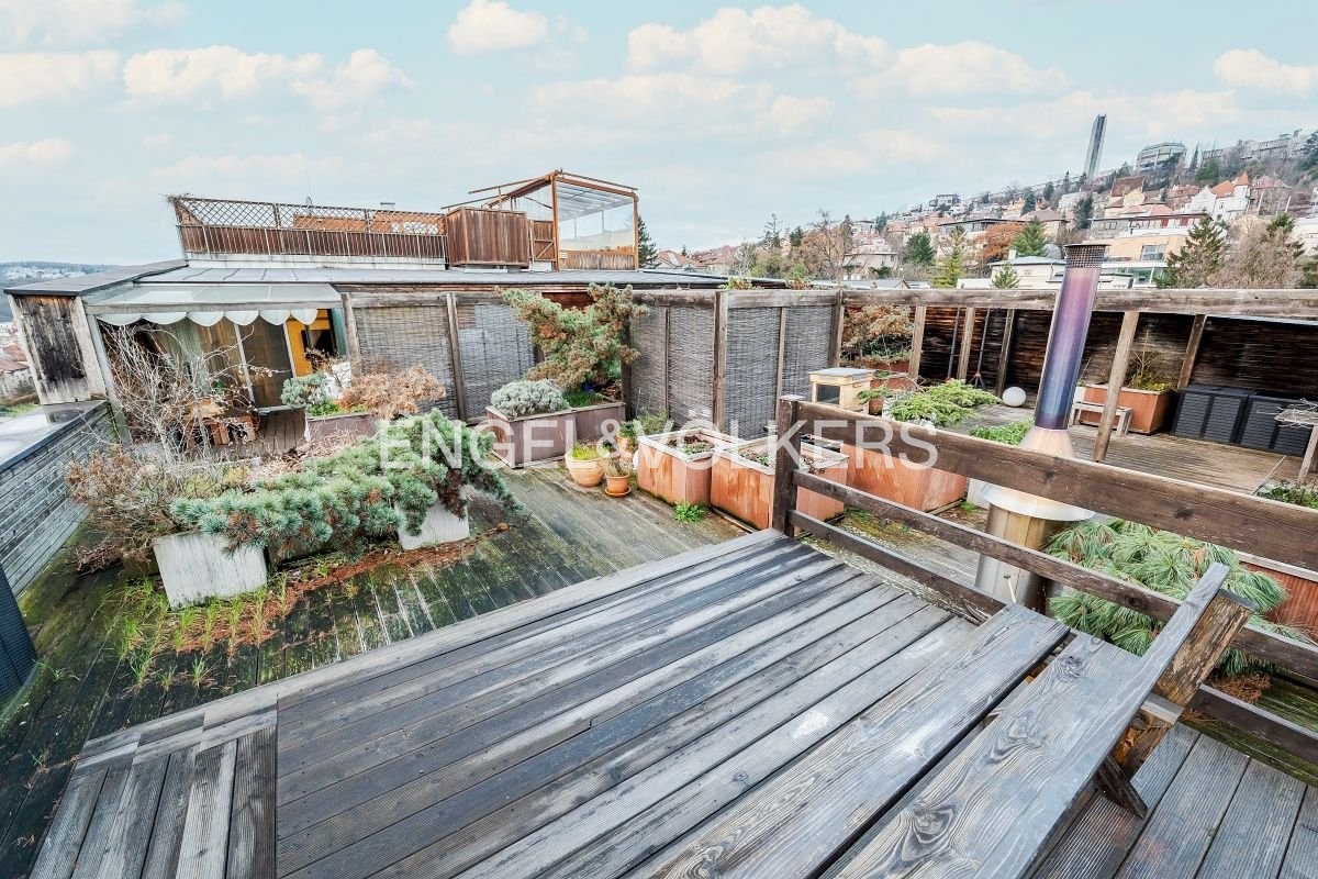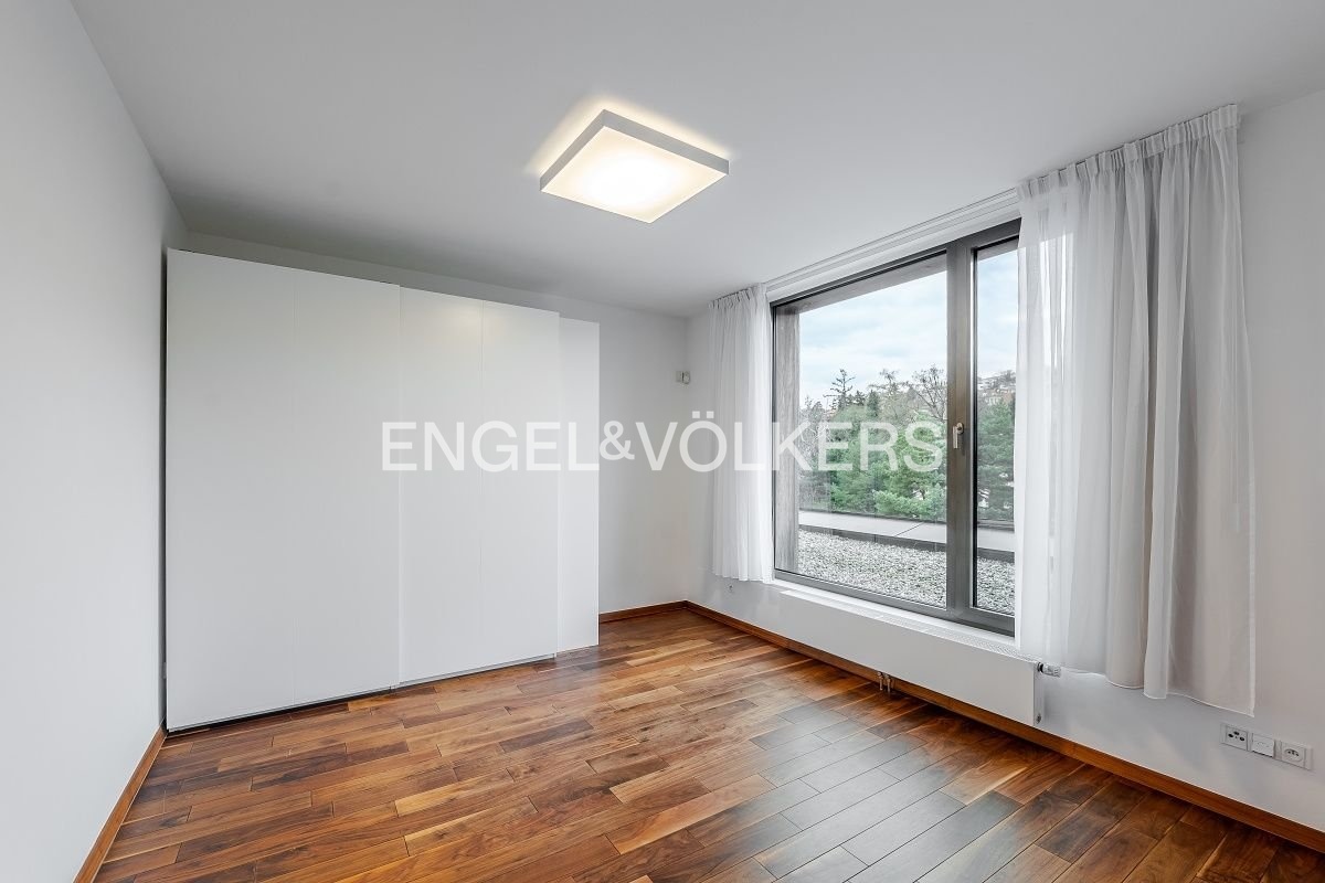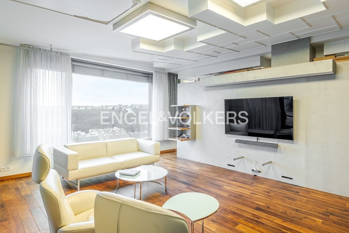 Interiér bytu tvoří prostorný obývací pokoj s plně vybavenou kuchyní špičkové kvality a přímým vstupem na terasu s překrásnými panoramatickými výhledy od Petřínských zahrad až po Tančící dům, dále dvě ložnice – jedna s prostornou šatnou a sprchovým koutem, pracovna vybavená kancelářskou židlí, stolem a úložným prostorem, koupelna a oddělená toaleta navíc.