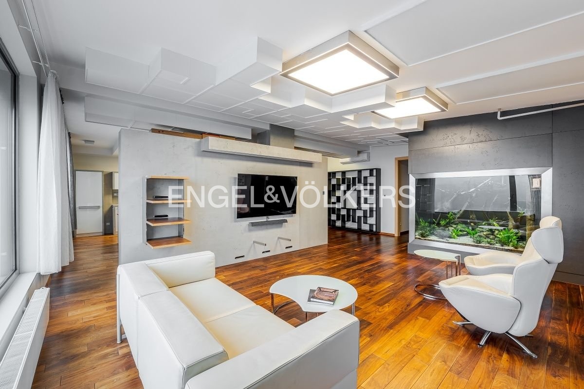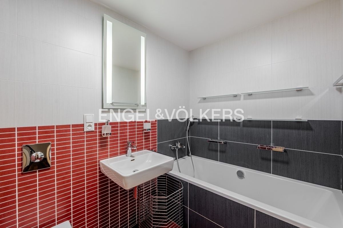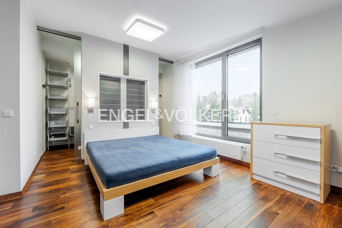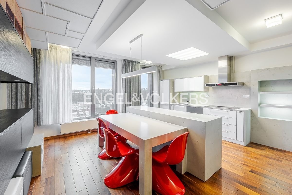 Byt je vybaven klimatizací, dřevěnými podlahami a unikátním designovým akváriem v obývacím pokoji. Součástí je také vlastní sklep o velikosti 8 m². V ceně nájmu jsou zahrnuta dvě garážová stání v podzemní garáži.