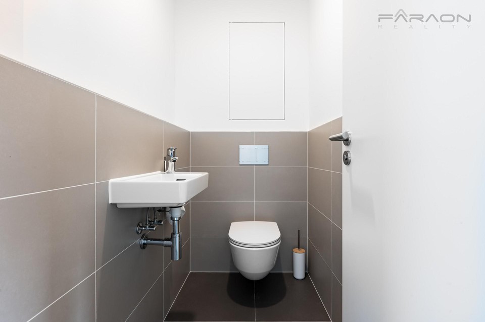Dispozice bytu 4+kk zahrnuje otevřený prostor obývacího pokoje s kuchyní, odkud je přístup na krásnou terasu, hlavní ložnici se sprchovým koutem a toaletou, dvě ložnice, chodbu, koupelnu s vanou, samostatnou toaletou, komoru, dvě garážové stání, sklep.