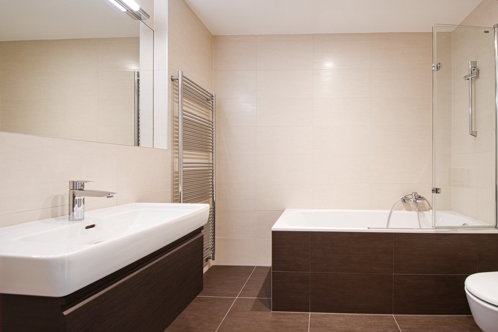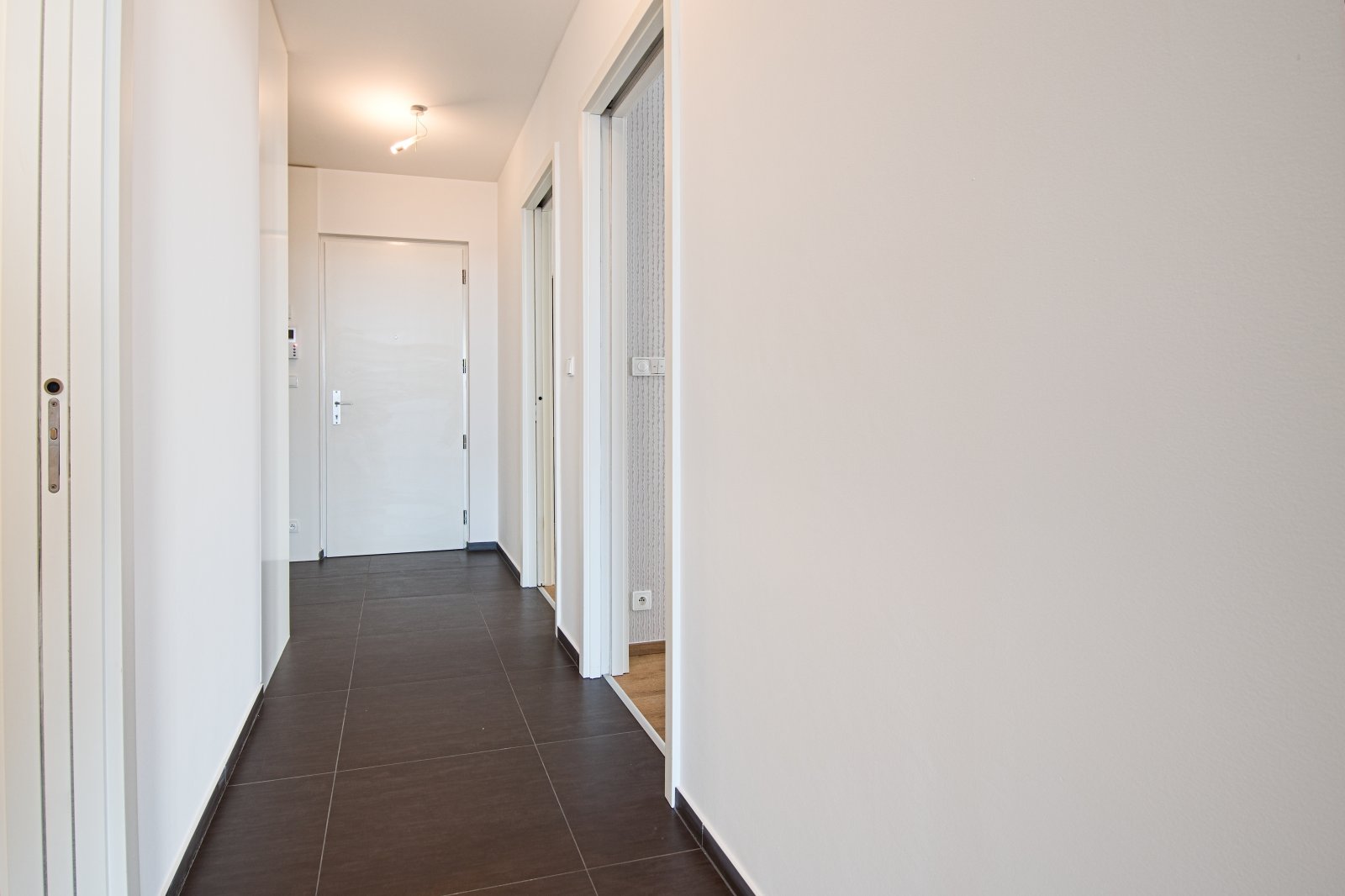 Dispozice bytu zahrnuje vstupní chodbu s úložnými prostory, prostorný obývací pokoj propojený s jídelnou a moderní kuchyní se vstupem na terasu, dvě ložnice a dvě koupelny. Hlavní ložnice má vlastní koupelnu se sprchovým koutem a toaletou, druhá koupelna je vybavena vanou a toaletou.