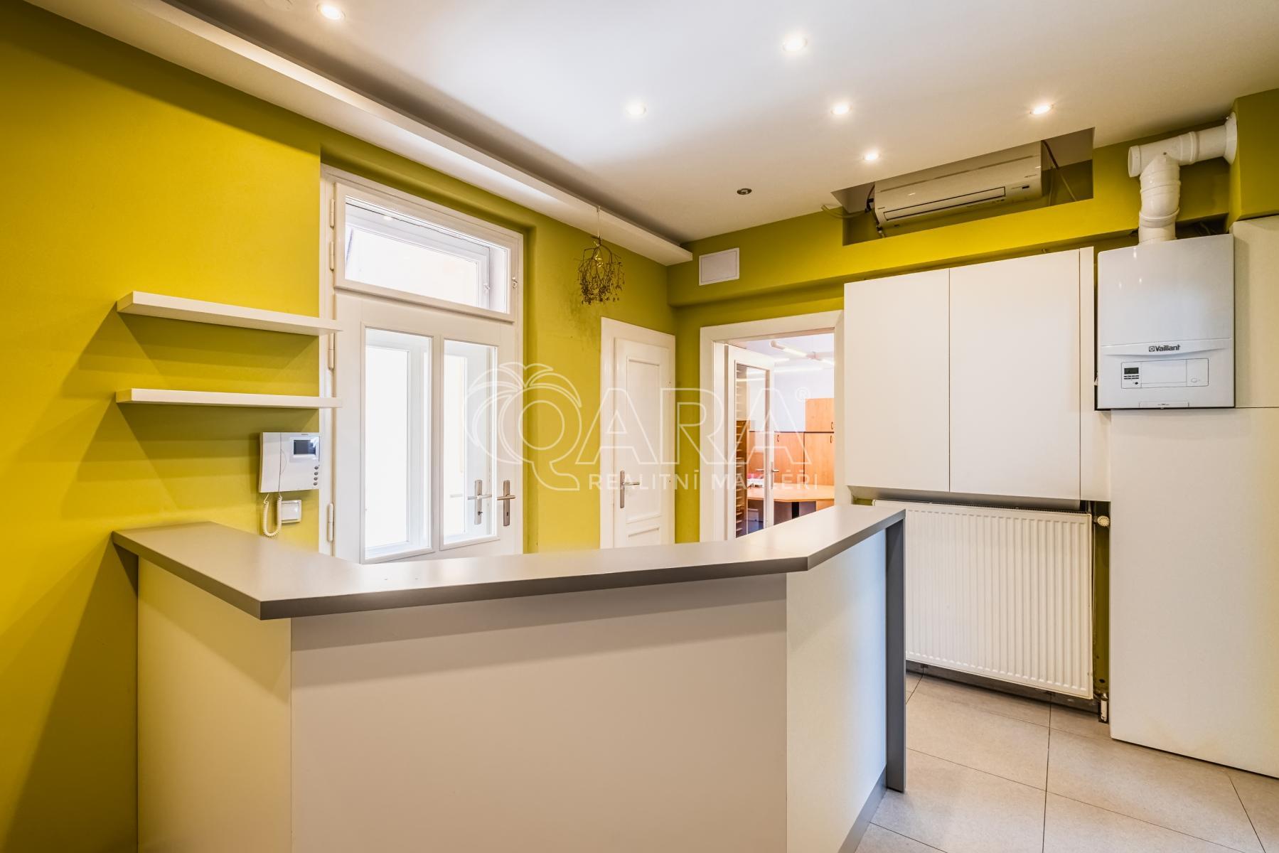 Exkluzivní kanceláře s vlastní recepcí, kuchyňkou a sociálním zařízením jsou situovány v poslední patře cihlového domu s výtahem.