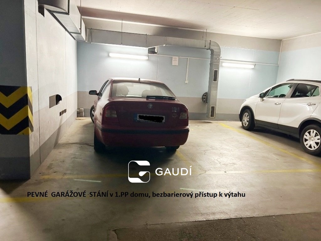 K pronájmu dále náleží možnost využívat GARÁŽOVÉ STÁNÍ pro 1 auto v 1.PP domu a uzamykatelné komory cca 5m2 v přízemí=1.NP, vše bezbariérově propojeno s výtahem v domě.