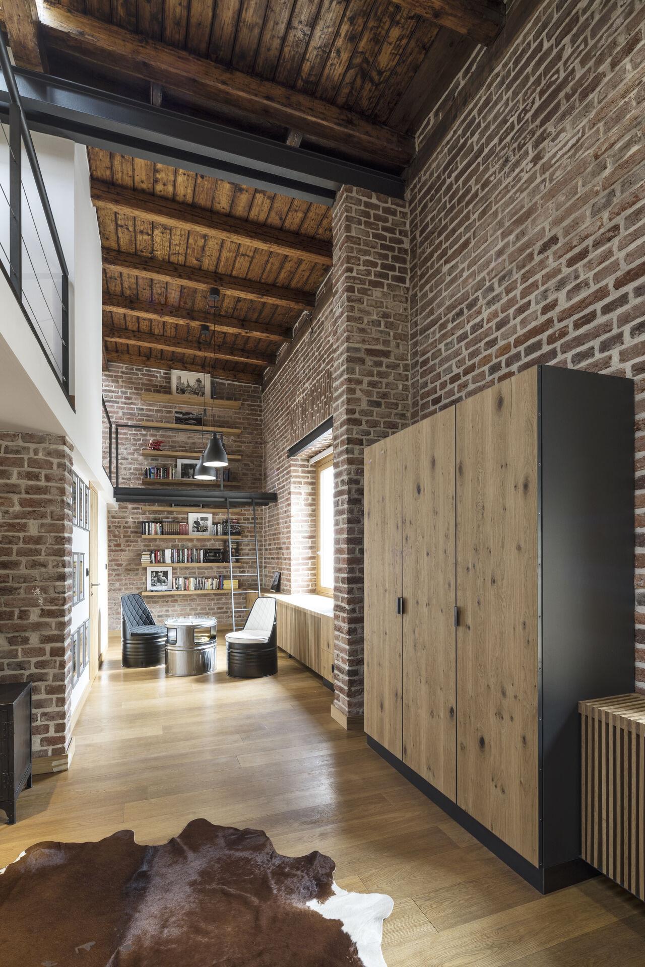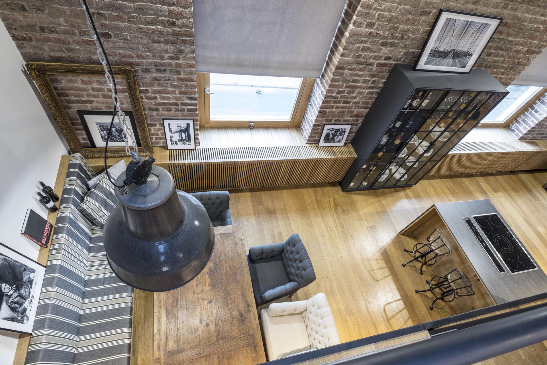 Dispozici bytu tvoří prostorná předsíň, oddělená zasunovacími dveřmi od ohromného obývacího pokoje s plně vybaveným kuchyňským koutem. Z obývacího pokoje vede schodiště do patra. Tam jsou dvě "pódia" - v jednom se nachází postel a je vybaveno pro spaní - ve druhém je pak pracovna. Dále je zde pak koupelna se sprchovým koutem a šatna. V bytě jsou dvě koupelny, v každém patře jedna - ve spodní je vana a prostor sloužící jako úložný prostor. V patře je druhá koupelna se sprchovým koutem a šatna.