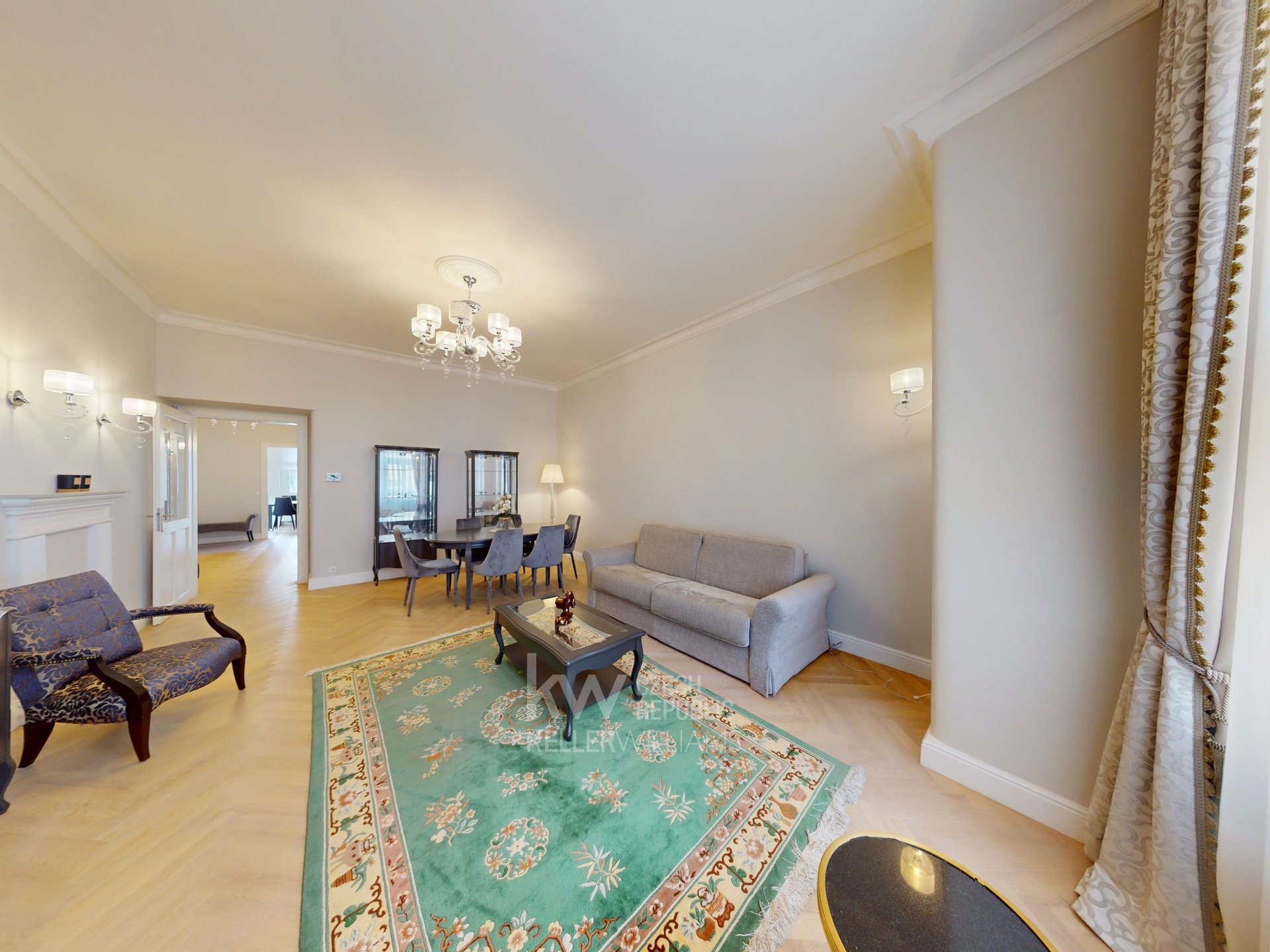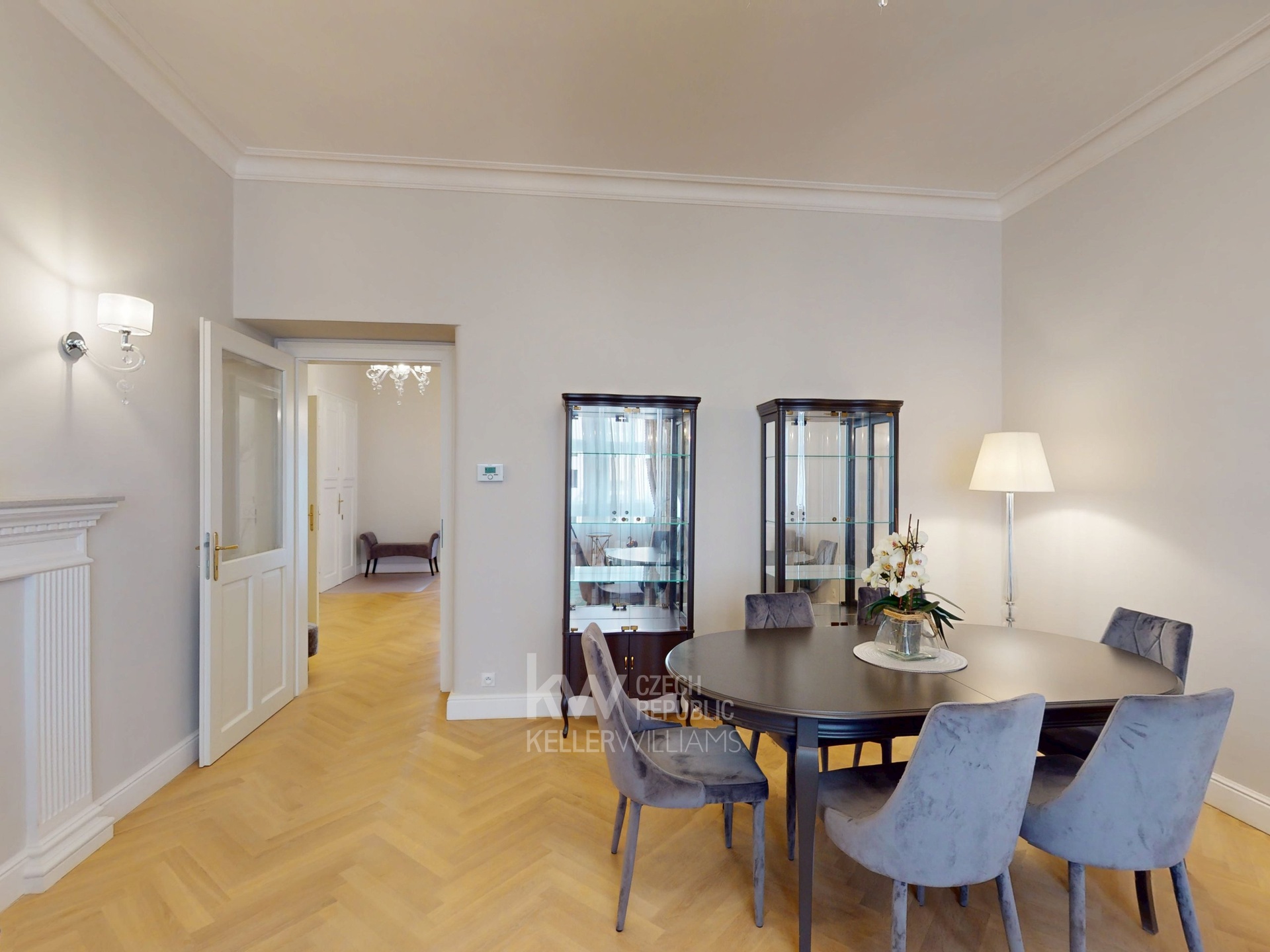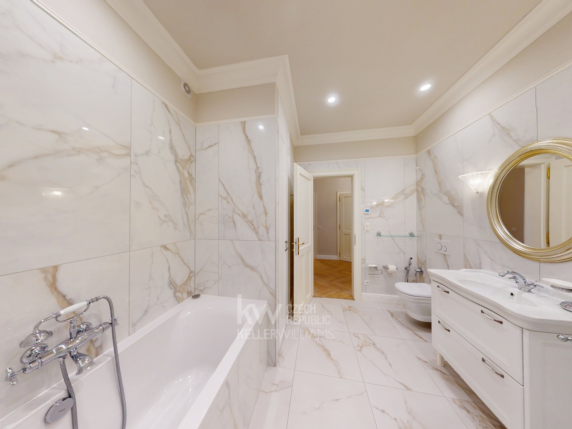 Prostorná vstupní hala podtrhuje nadčasovou eleganci celého bytu, doplněná velkým designovým zrcadlem, nástěnnými svítidly a stylovým lustrem. Praktickou součástí je samostatná walk-in šatna s množstvím úložného prostoru. Celý byt zdobí kvalitní dřevěné parkety, které umocňují luxusní atmosféru.