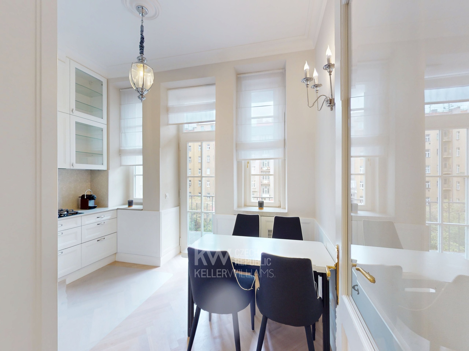 Samostatná kuchyň je plně vybavená spotřebiči, pracovní deskou z Technistone, kávovarem Nespresso a varnou konvicí, jídelním setem. Snídaňový stůl pro 4 osoby doplňují prostor, který se otevírá na prostornou lodžii s výhledem do klidného vnitrobloku, ideální pro relaxaci.