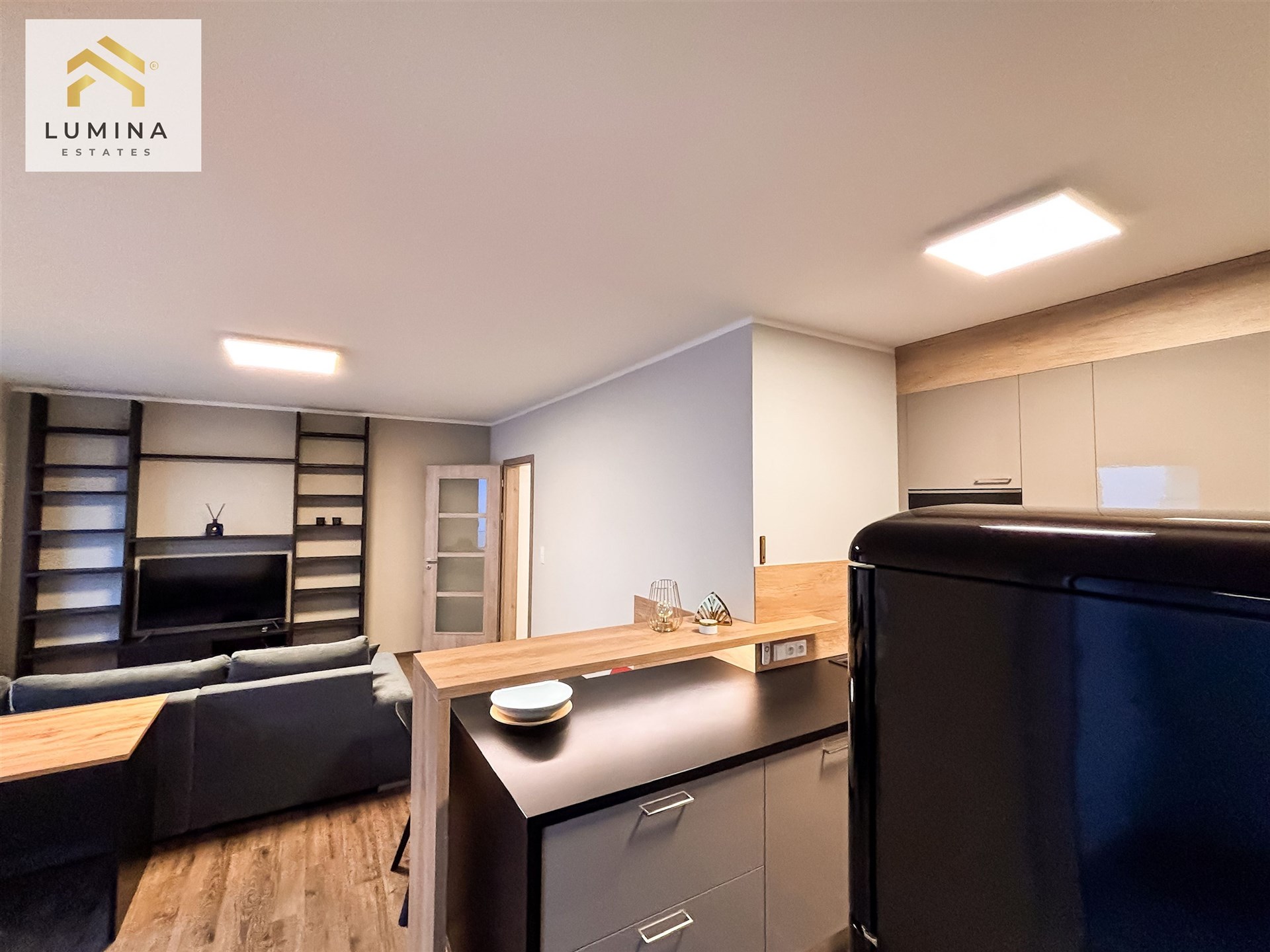 Byt je ideálně rozložen a vstup prostornou předsíní se skříněmi ústí do obývacího pokoje spojeného s plně vybavenou kuchyňskou linkou (s indukční varnou deskou, elektrickou troubou, myčkou, odsavačem a lednicí s mrazákem). Kuchyňská linka je moderně a funkčně navržena. Ostatní vybavení bytu naleznete ve fotogalerii (manželská postel s matrací, skříně, sedací souprava, jídelní a pracovní stůl, TV...)
