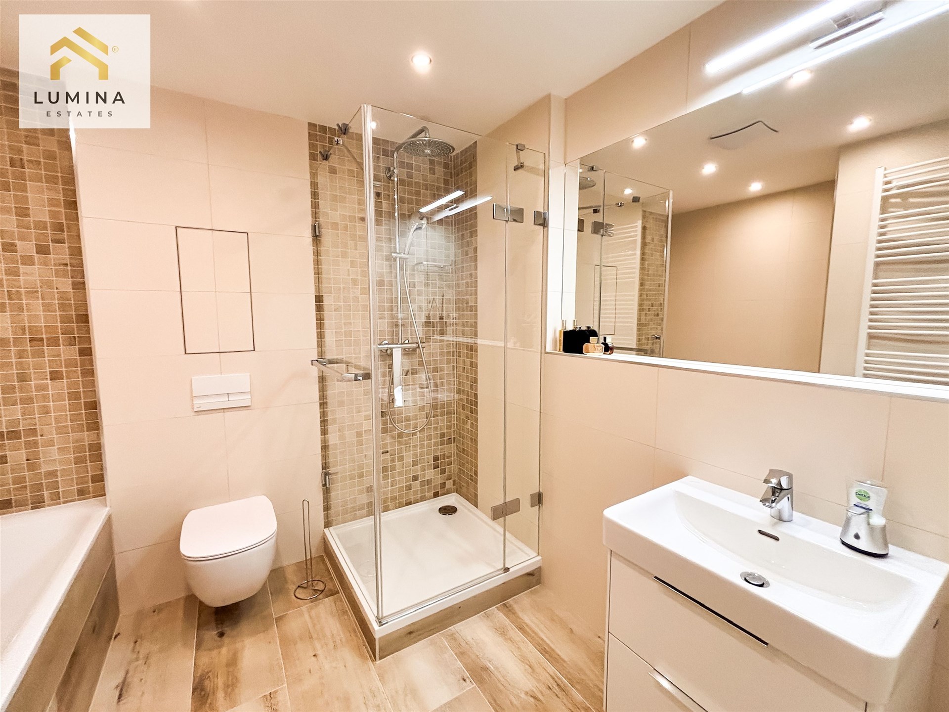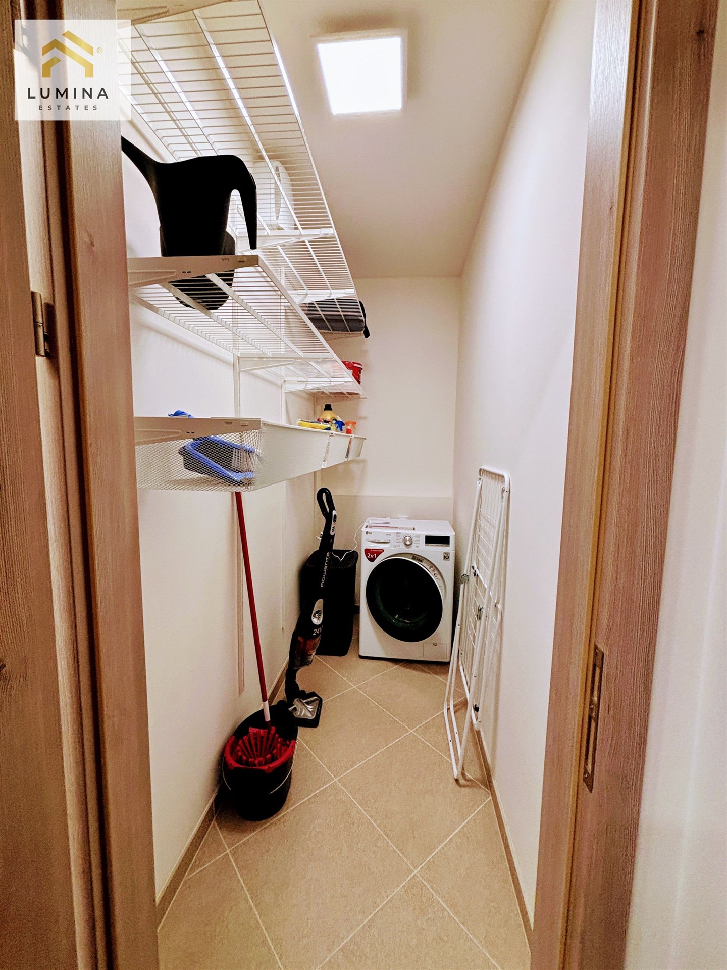 Svou velikostí a komfortem vás překvapí koupelna spojena s WC, vedle samostatné prostorné komory, kde je krom nástěnných polic umístěna pračka se sušičkou