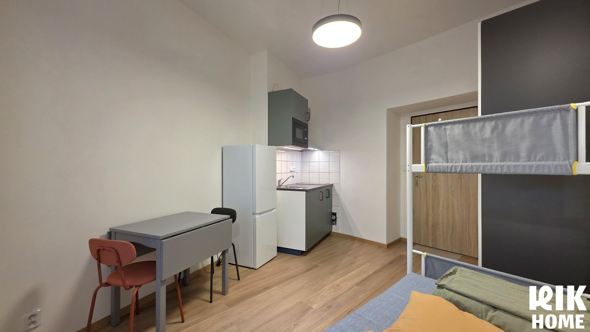 Hlavní místnost je prostorná a světlá, s velkým plastovým oknem opatřeným žaluziemi. Místnost je vybavena vestavěnou šatní skříní s bílými dveřmi a černými úchytkami a praktickou kovovou patrovou postelí. V obytné části se nachází také skládací šedý stůl se dvěma židlemi. Kuchyňský kout je osazen moderní kuchyňskou linkou v matně zelené barvě s černými úchytkami a nerezovými detaily, která je plně vybavena spotřebiči: varnou deskou, digestoří, vestavěnou mikrovlnnou troubou a volně stojící kombinovanou chladničkou.