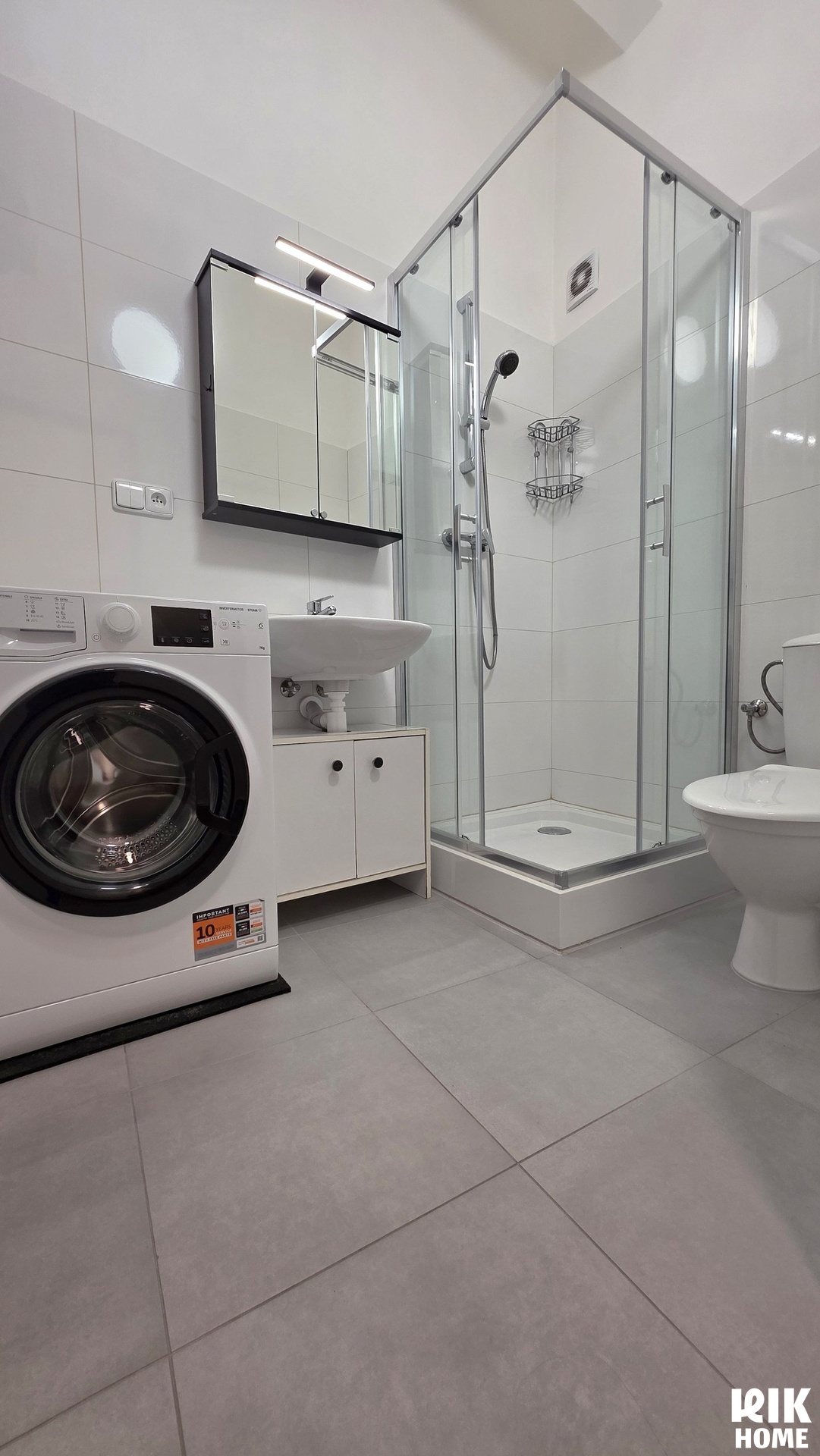 Moderní koupelna je vybavena sprchovým koutem s prosklenou zástěnou, umyvadlem se skříňkou, zrcadlovou skříňkou s osvětlením, toaletou a pračkou. Stěny i podlaha jsou obloženy vkusnými velkoformátovými obklady a dlažbou.