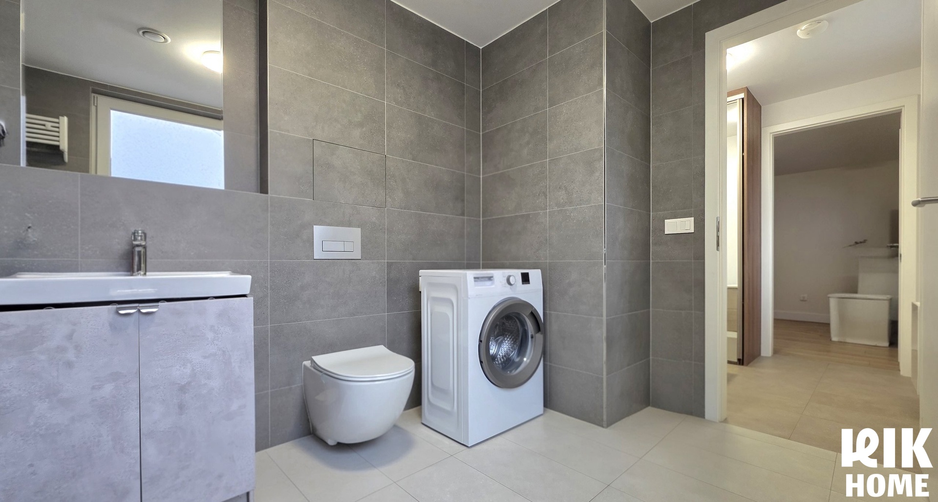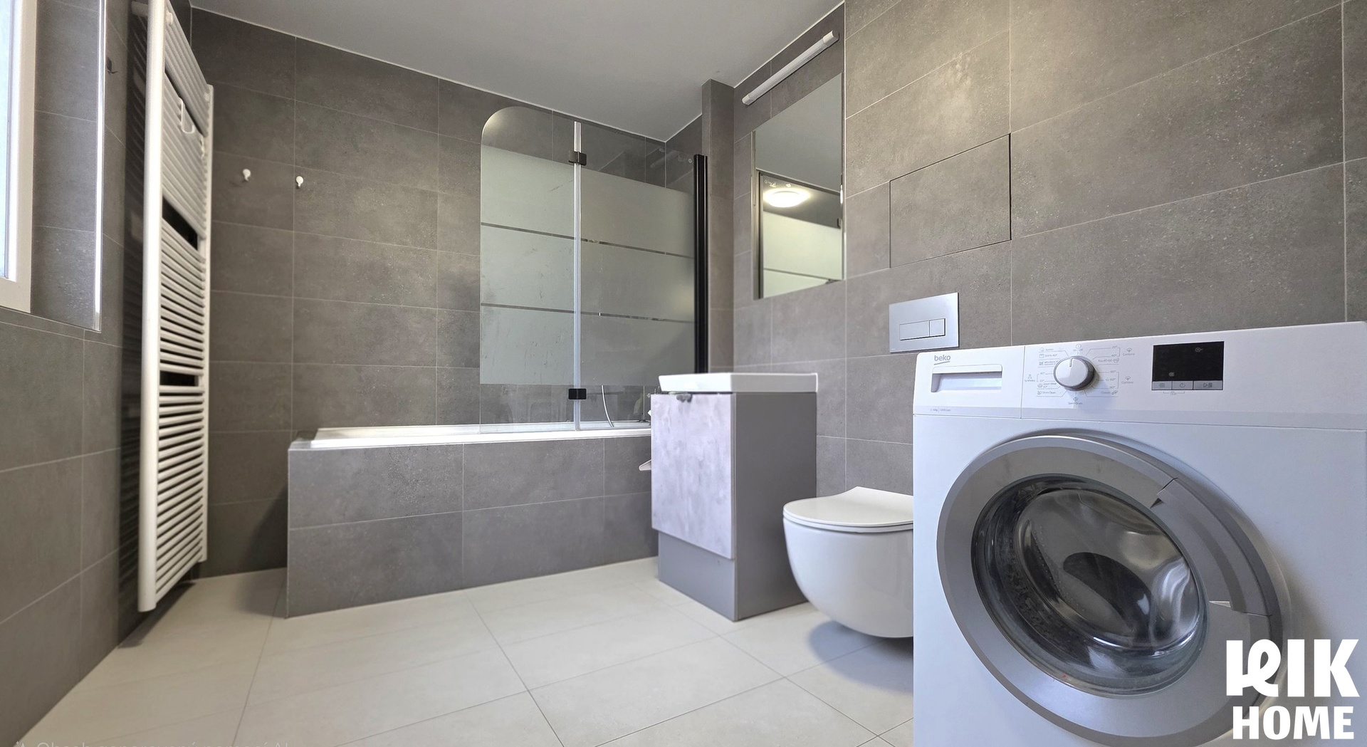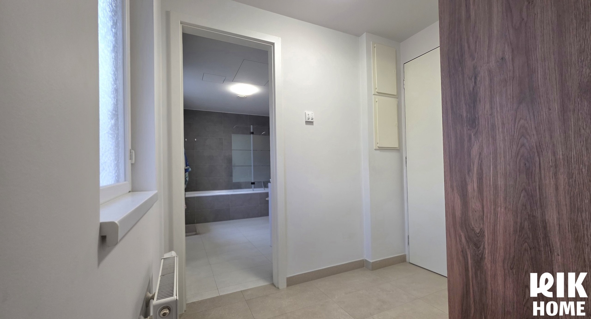 • Koupelna: Vana se skleněnou zástěnou, toaleta, moderní obklady.