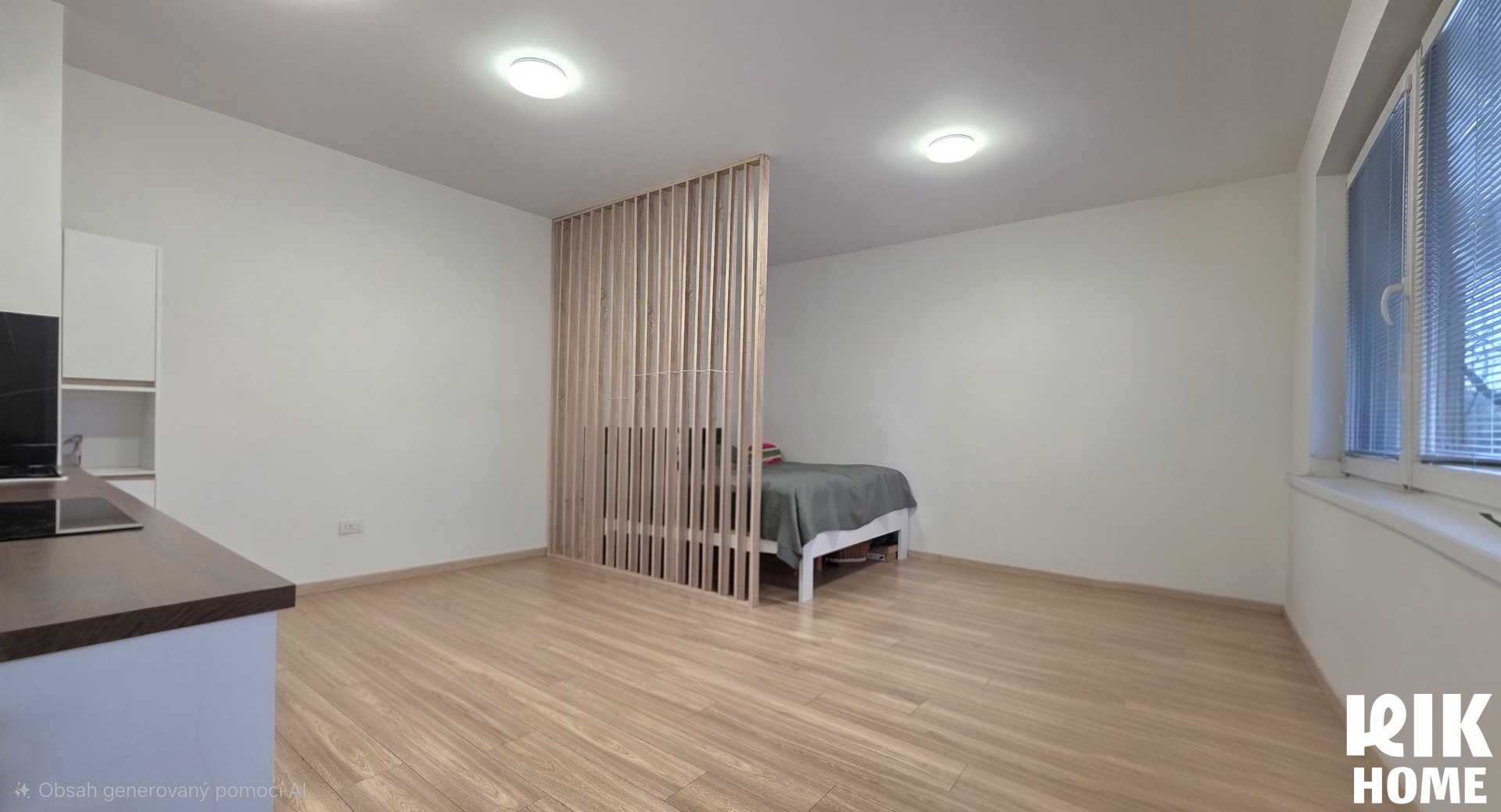 Interiér je efektivně rozčleněn designovou dřevěnou příčkou, která opticky a funkčně odděluje obývací část s kuchyní od spací zóny.