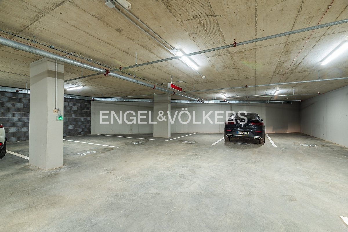 K bytu je možné pronajmout garážové stání za 4 500 Kč měsíčně. Do garáže se vjíždí auto-výtahem, je velmi prostorná, tedy vhodná i pro automobily větších rozměrů.