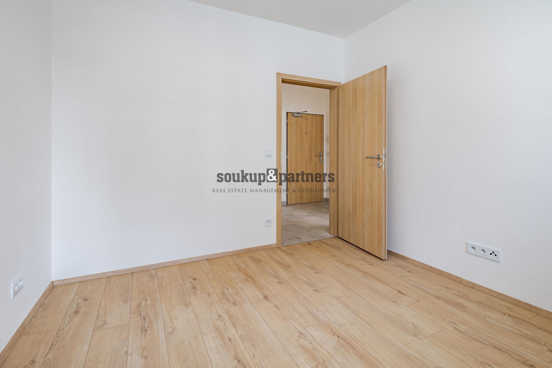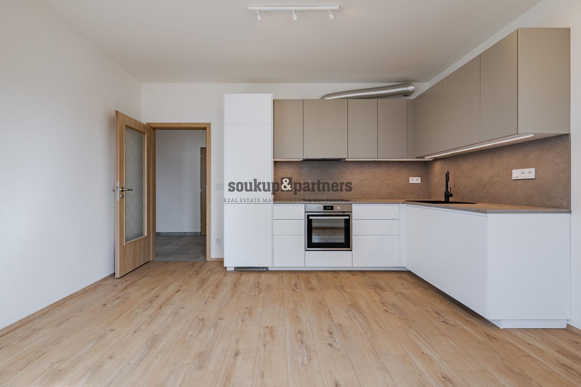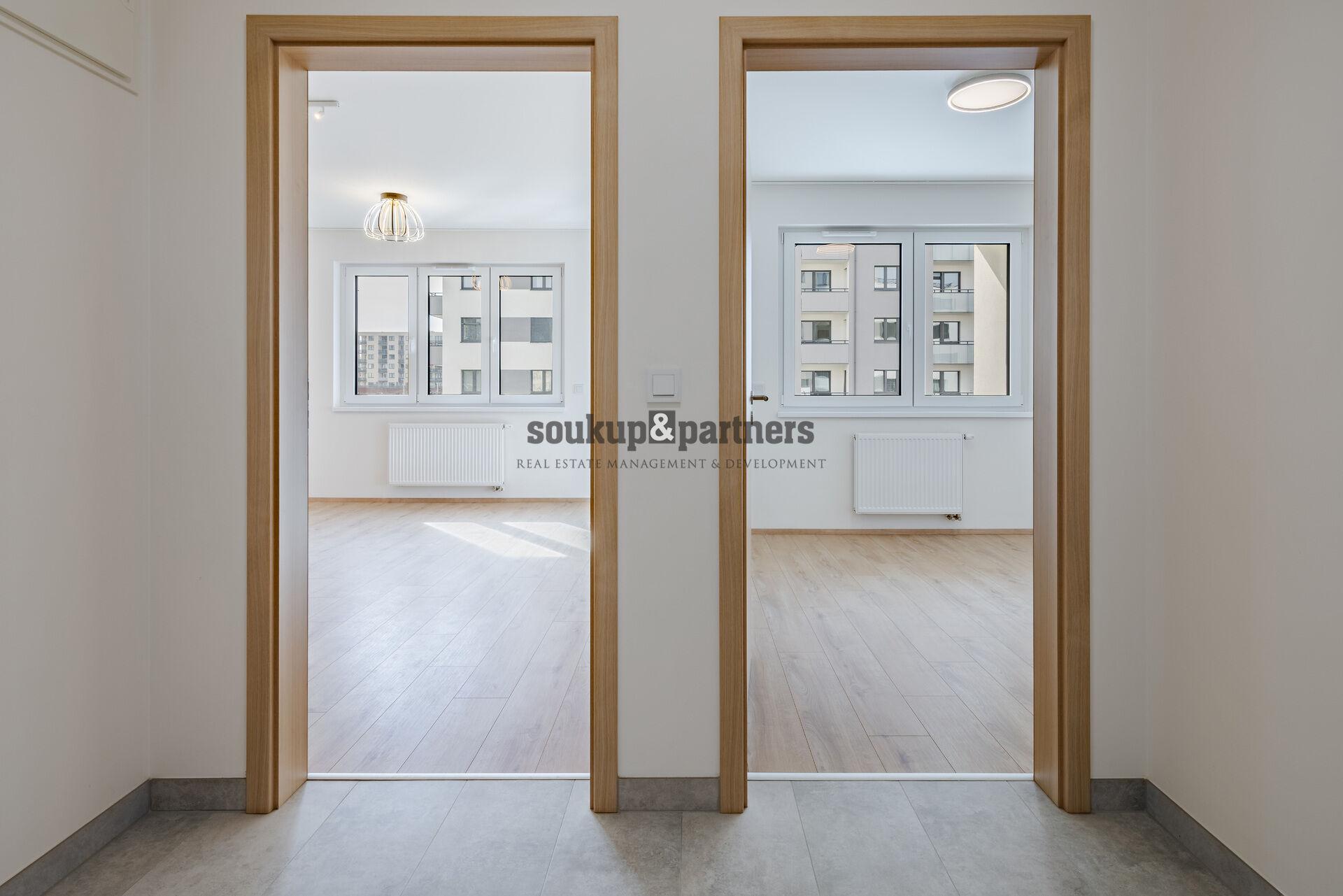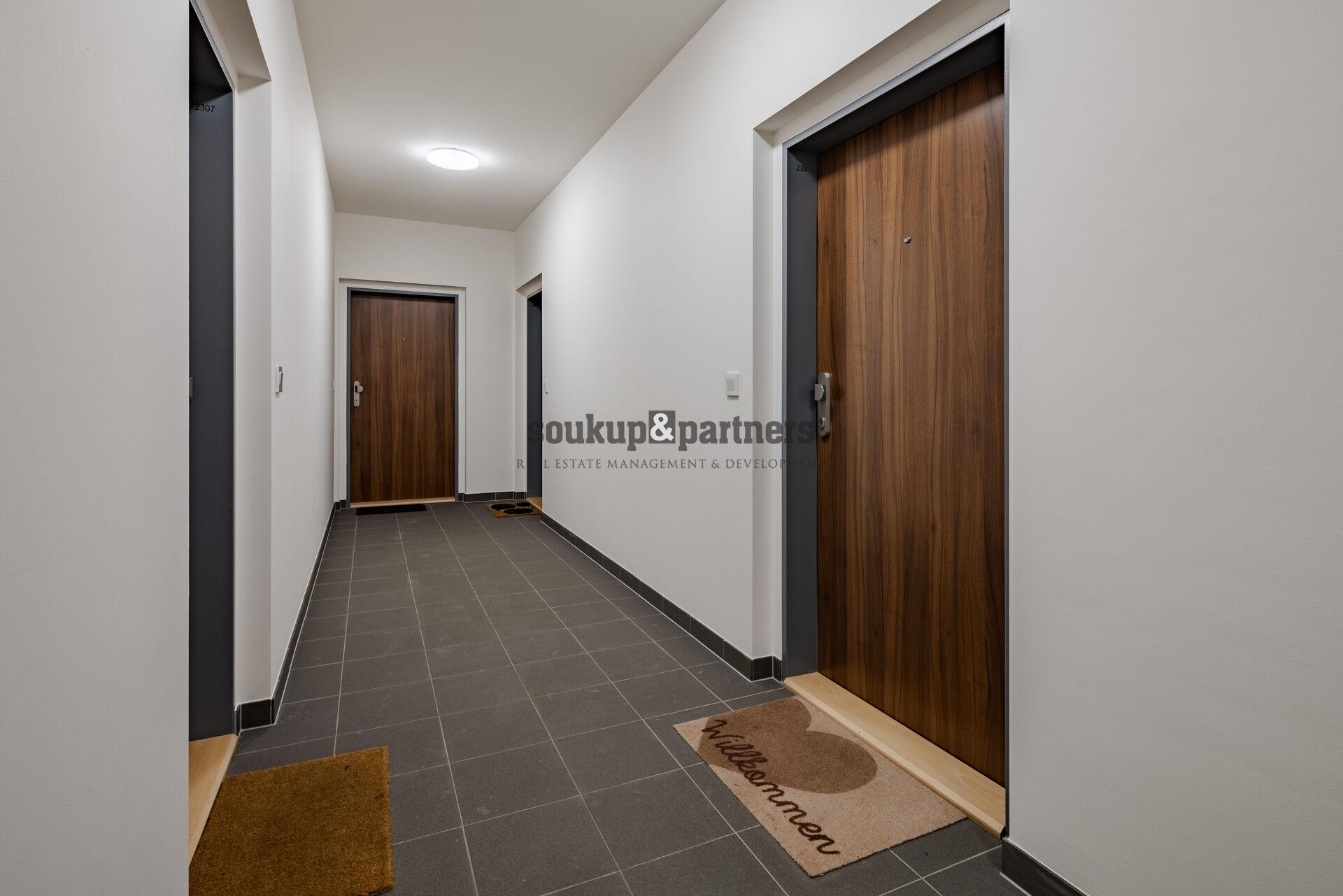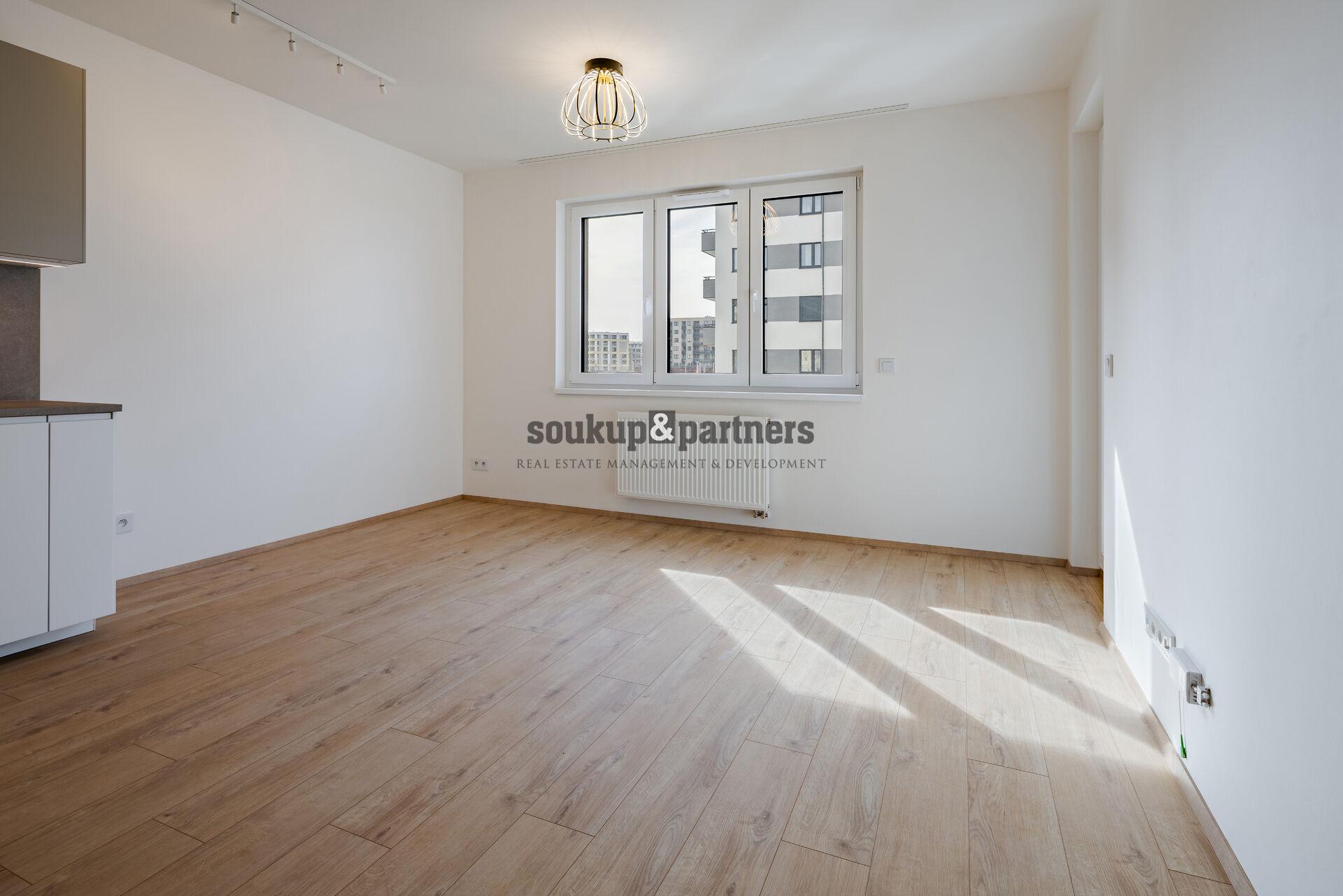Byt je orientovaný na západ, což zajišťuje příjemné odpolední a večerní světlo. Obývací pokoj s kuchyňským koutem nabízí vstup na balkon s výhledem do okolí. Kuchyňská linka je vyrobena na míru a plně vybavena spotřebiči (myčka, horkovzdušná trouba, indukční varná deska, digestoř, lednice s mrazákem). Samostatná ložnice je rovněž orientovaná na západ. Koupelna je moderní s velkým sprchovým koutem a závěsným WC. Vstupní chodba poskytuje dostatek prostoru pro šatní skříň a úložné řešení.