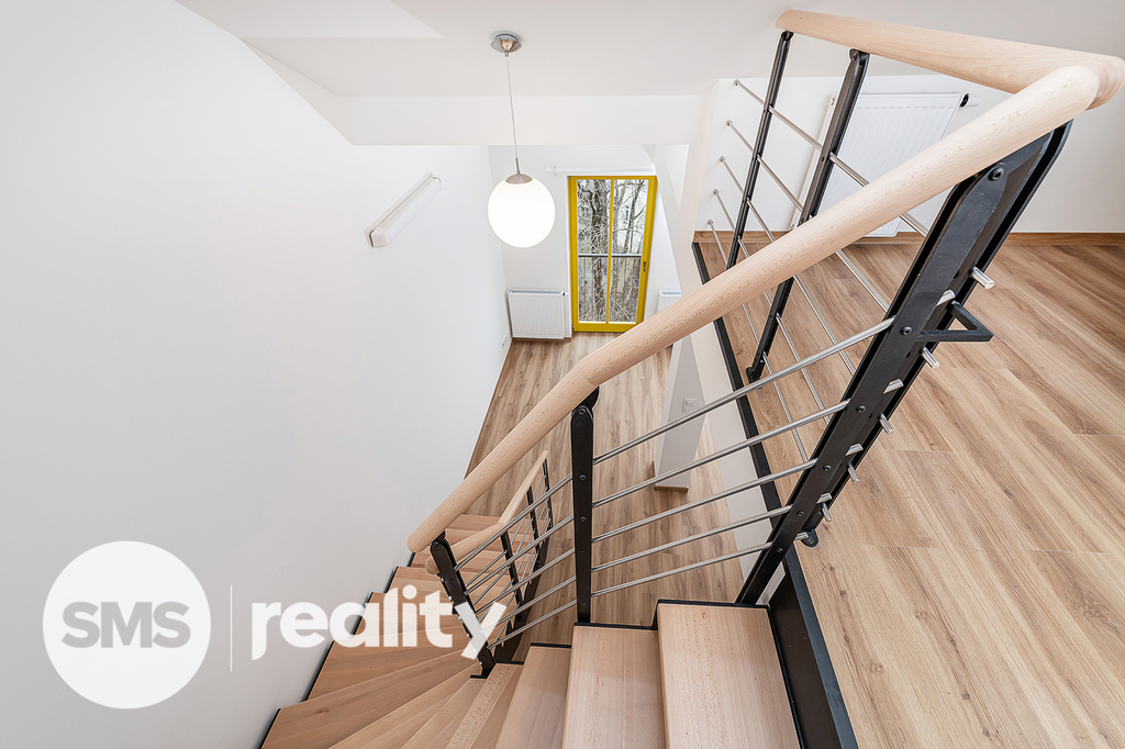 • Přízemí bytu: zádveří, koupelna s toaletou, obývací pokoj s francouzskými okny, novou kuchyňskou linkou s vestavnými spotřebiči a schodištěm do patra.