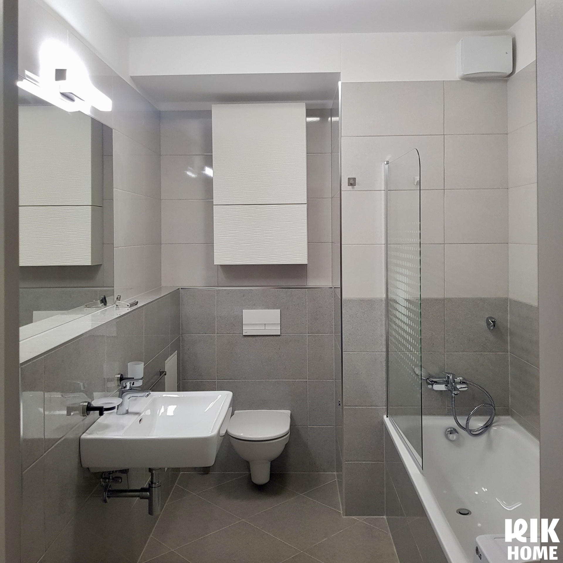 - Koupelna: Vana se skleněnou zástěnou, závěsné WC, úložné prostory.