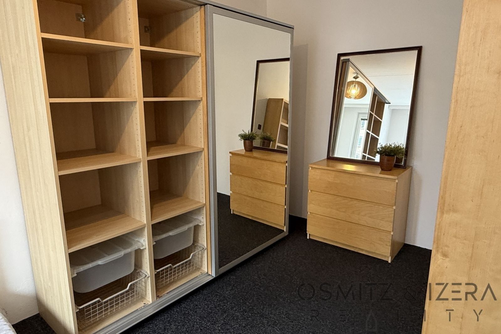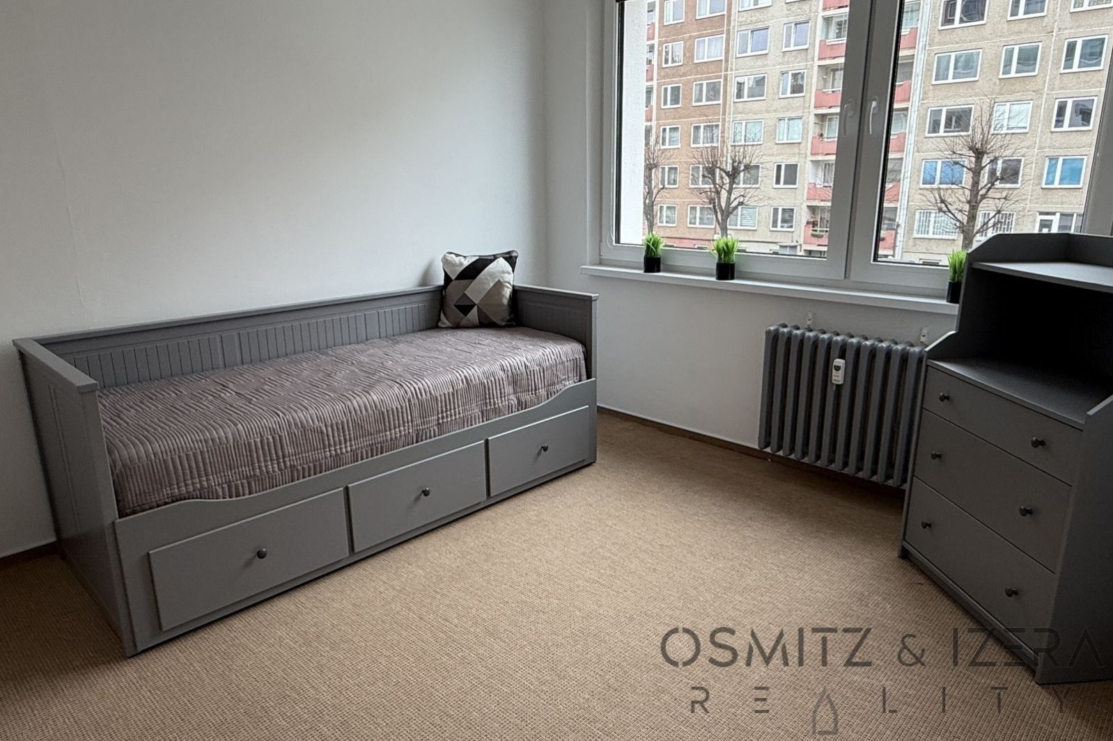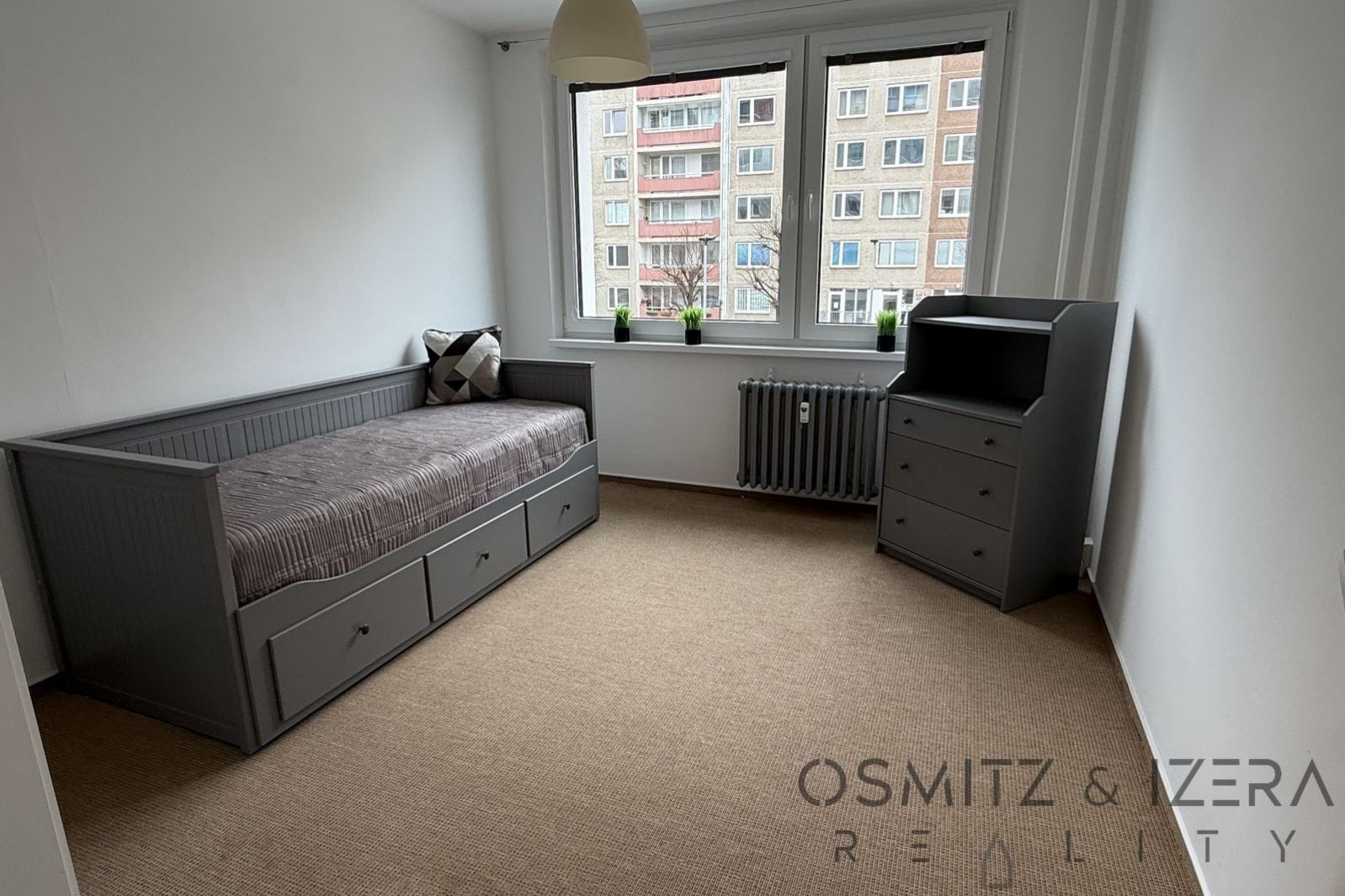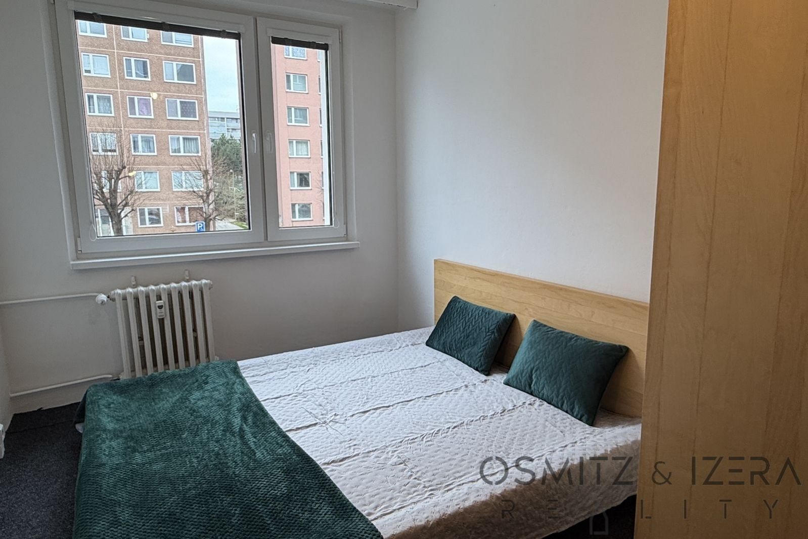Byt se skládá z velkého obývacího pokoje spojeného s kuchyňským koutem a se vstupem na balkon. V kuchyně je velká kuchyňská linka se spotřebiči a je zde i prostor na pracovnu. Prostorná vstupní chodba se skříní dále pokračuje ke koupelně s vanou, samostatným WC a komorou, kde je připojení na pračku. Dvě ložnice jsou orientované na západ, jsou zde plastová okna se žaluziemi. Byt je kompletně zařízen nábytkem a je ihned k nastěhování. Lodžie je orientovaná na východ do vnitrobloku s dětským hřištěm. Momentálně probíhá na domě zateplení fasády a v rámci toho zasklívání balkonů.