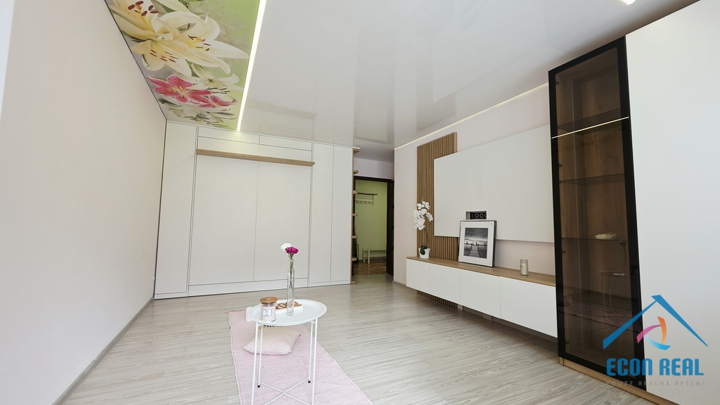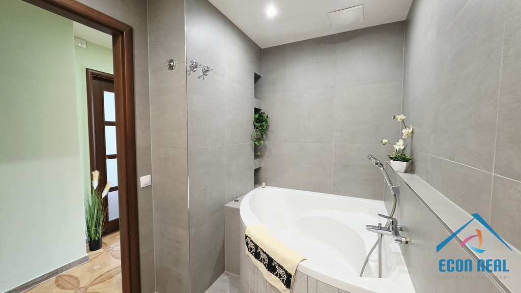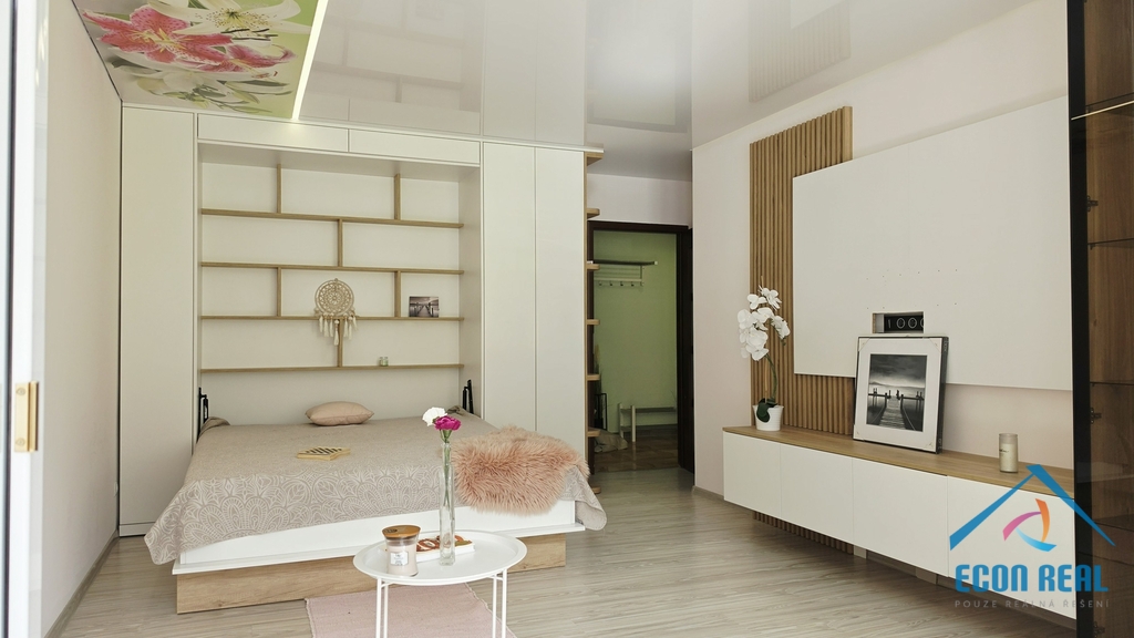 Jídelní část nabízí rohovou lavicí s úložným prostorem a jídelním stolem. Stávající obývací pokoj je (jak již bylo řečeno dříve) vybaven sklápěcím manželským lůžkem, což oceníte zejména v případě návštěvy. V jedné z ložnic se nachází větší postel s černým rámem a šatní skříň. Příjemná a na poměry panelákového bytu prostorná koupelna disponuje rohovou vanou, umyvadlem se skříňkou, galerkou se zrcadlem, přípojkou na pračku a poličkami. Toaleta je samostatná. Zasklená lodžie umožní prodloužení obytného prostoru nejen na odpočinek, ale třeba i na pěstování. Všechna okna i balkonové dveře jsou opatřeny žaluziemi.