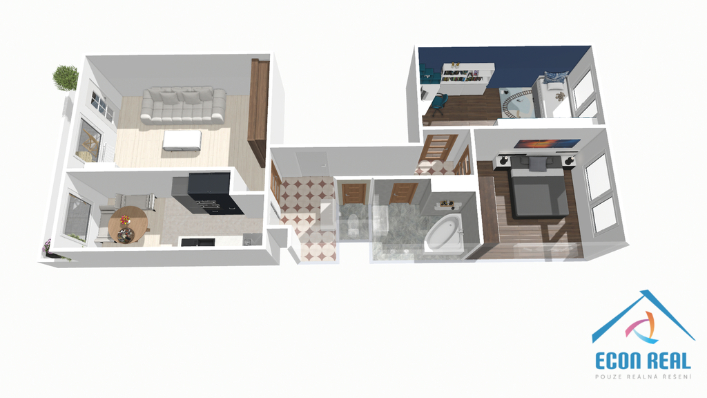 Dispozice bytu je praktická: byt směřuje na dvě strany (optimum větrání), kuchyň je řešena jako samostatná místnost s vlastním oknem (přirozené denní světlo a též větrání), nezasahující do prostoru obývacího pokoje, který je zároveň vybaven vestavnou sklápěcí postelí (tedy skvělé v případě větší rodiny, či pokud přijede tchýně na víkend :)). Koupelna a toaleta jsou samostatné a v bytě jsou různé úložné prostory a skříně.