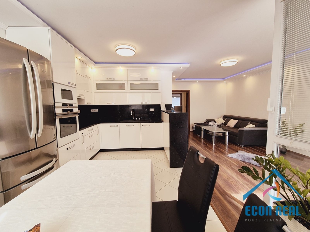 Obývací pokoj je propojený s velmi kvalitně vybaveným kuchyňským koutem (velká lednice s mrazákem, trouba, digestoř, mikrovlnná trouba, myčka, pračka, jídelní stůl se židlemi, barový pult s policemi...) a disponuje dále i zánovní rohovou sedačkou, TV stolkem a televizí.