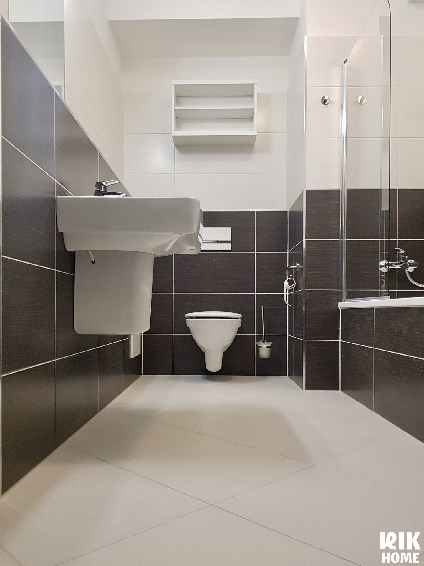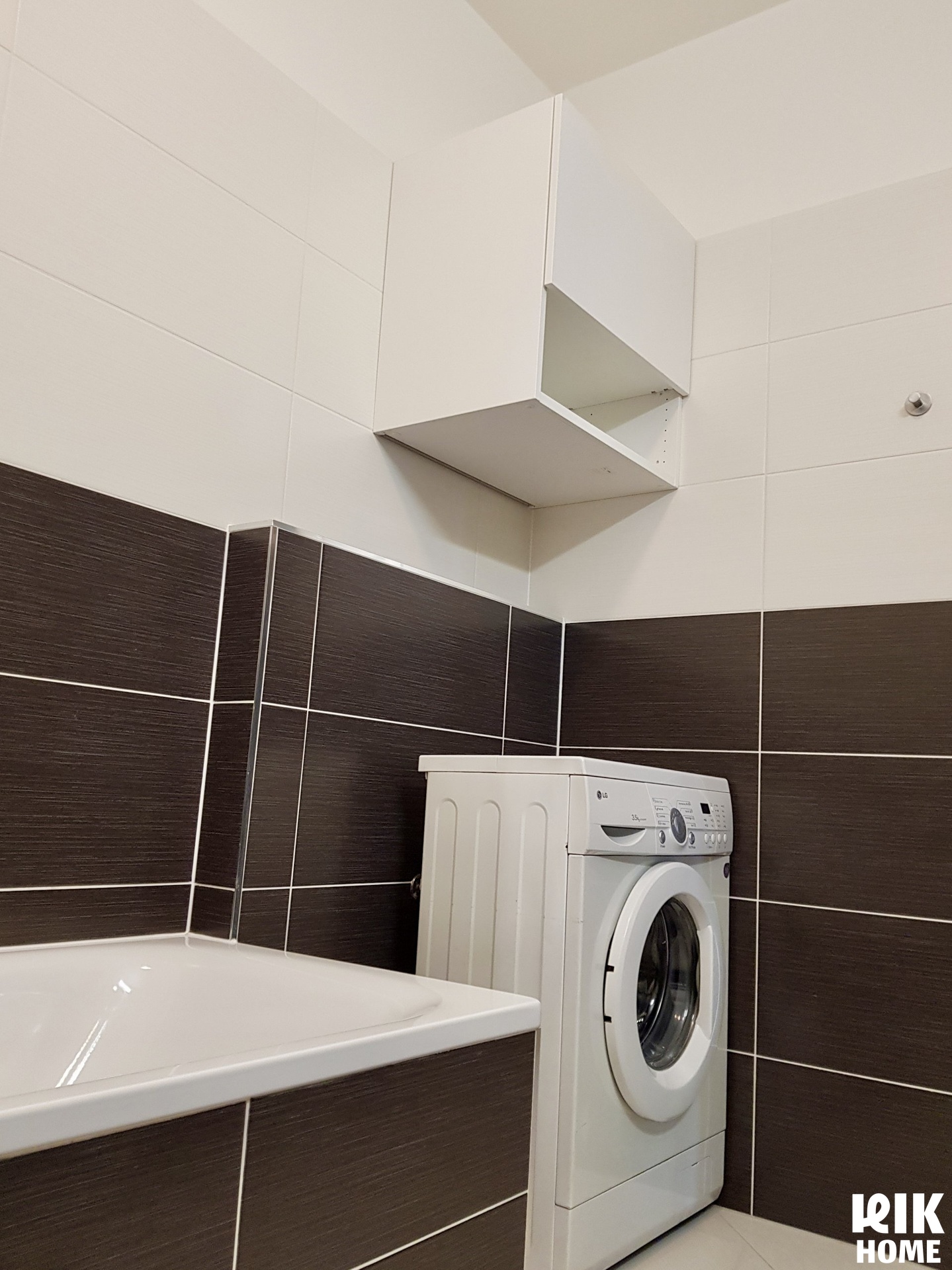 - Koupelna: Vana se skleněnou zástěnou, pračka, závěsné WC a úložné skříňky.