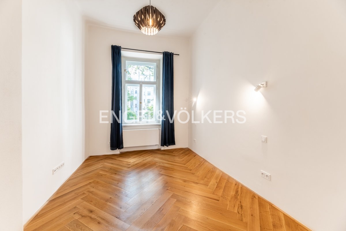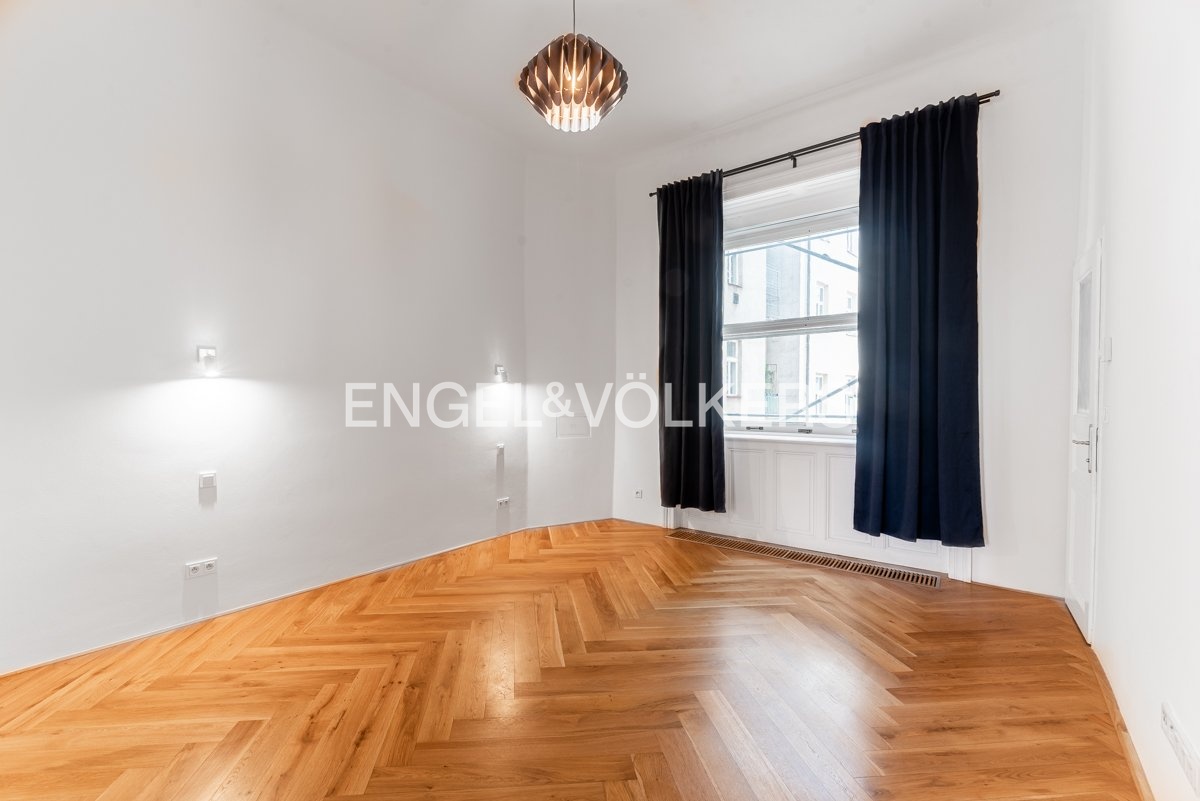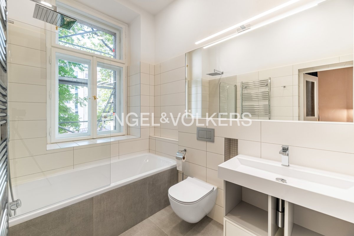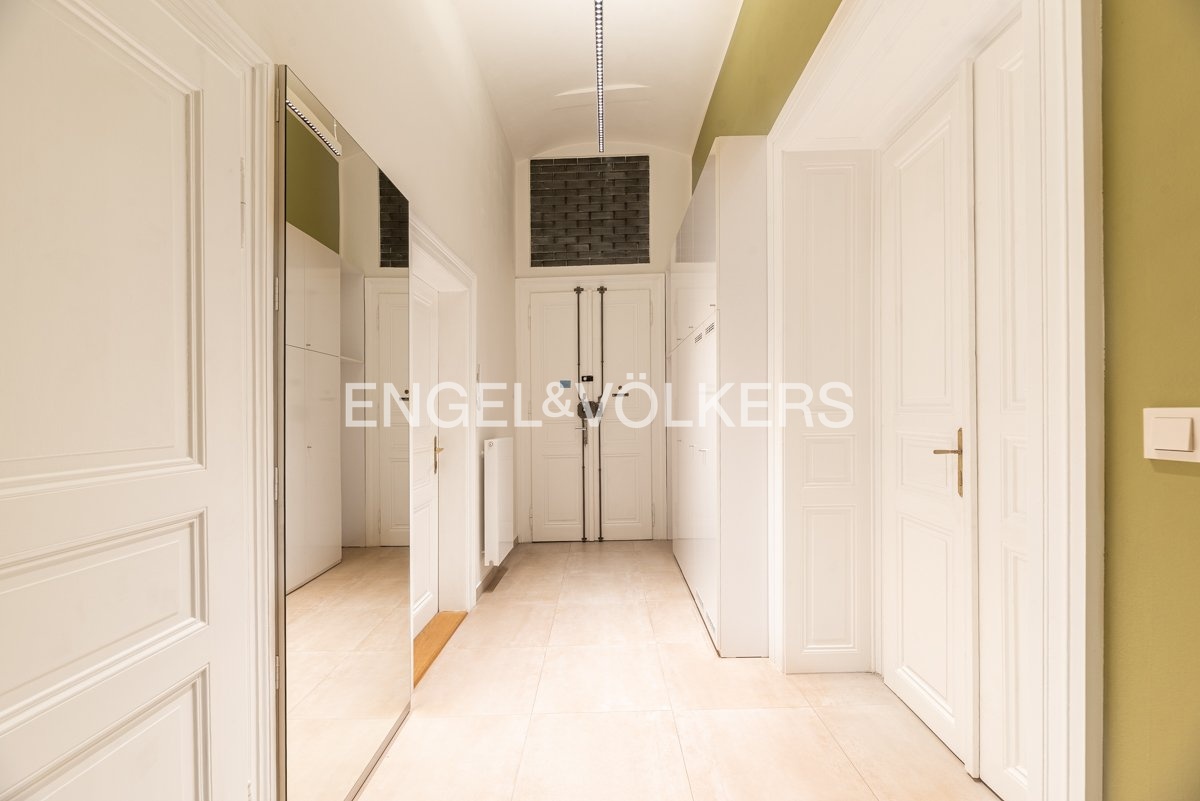 Kompletně zrekonstruovaný byt 3+kk o rozloze 106 m² s panoramatickým výhledem na Vltavu a ikonické pražské památky, včetně Tančícího domu a kláštera Emauzy, se nachází ve 2. podlaží pečlivě udržovaného historického domu v neorenesančním stylu na Janáčkově nábřeží.