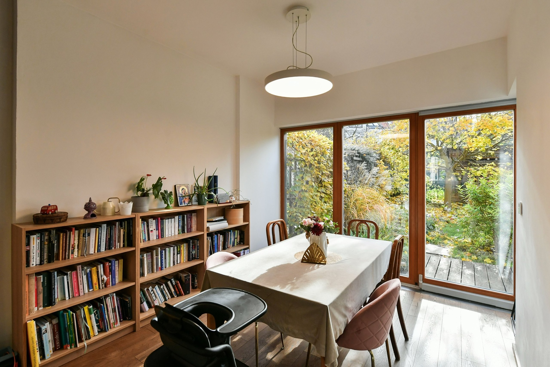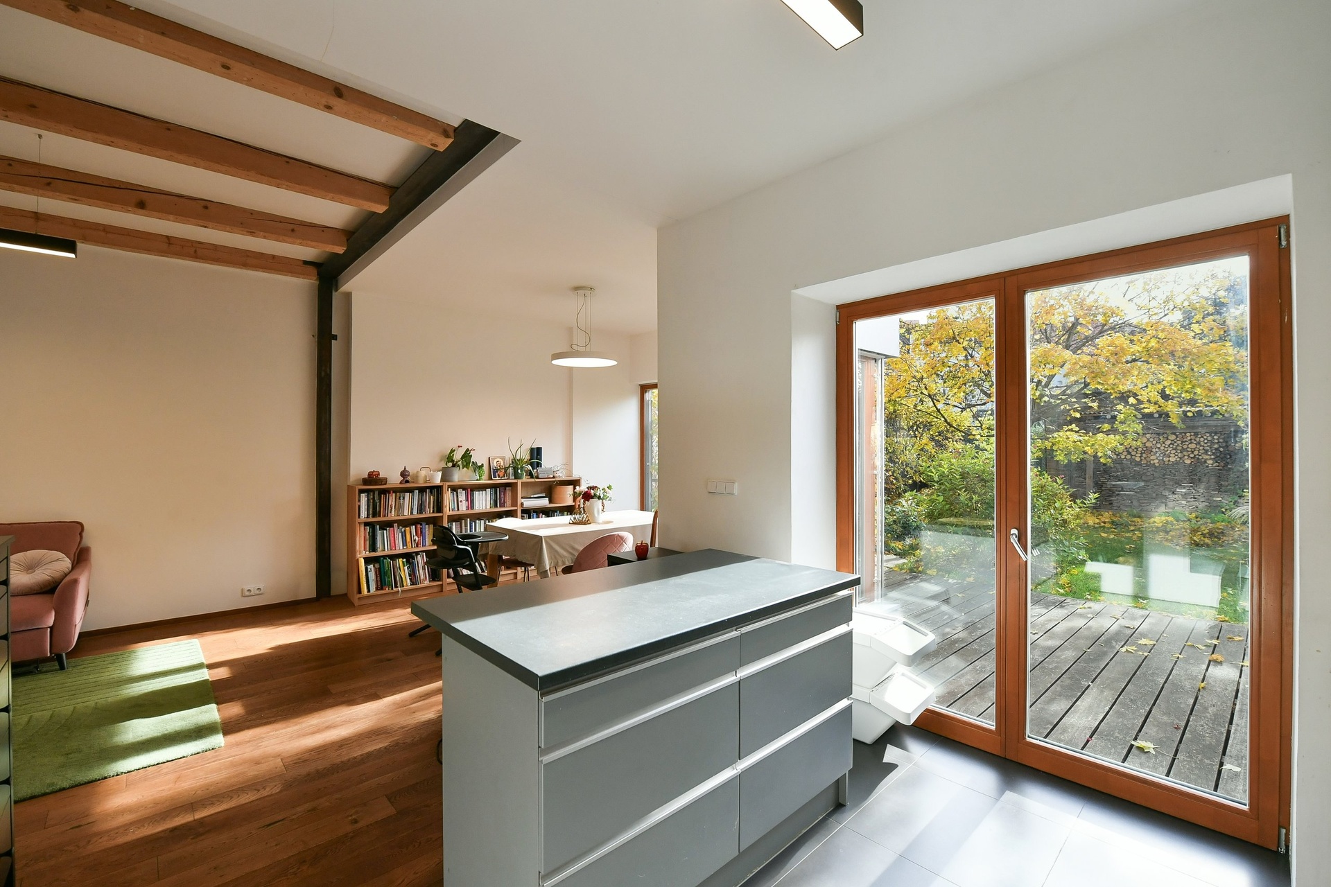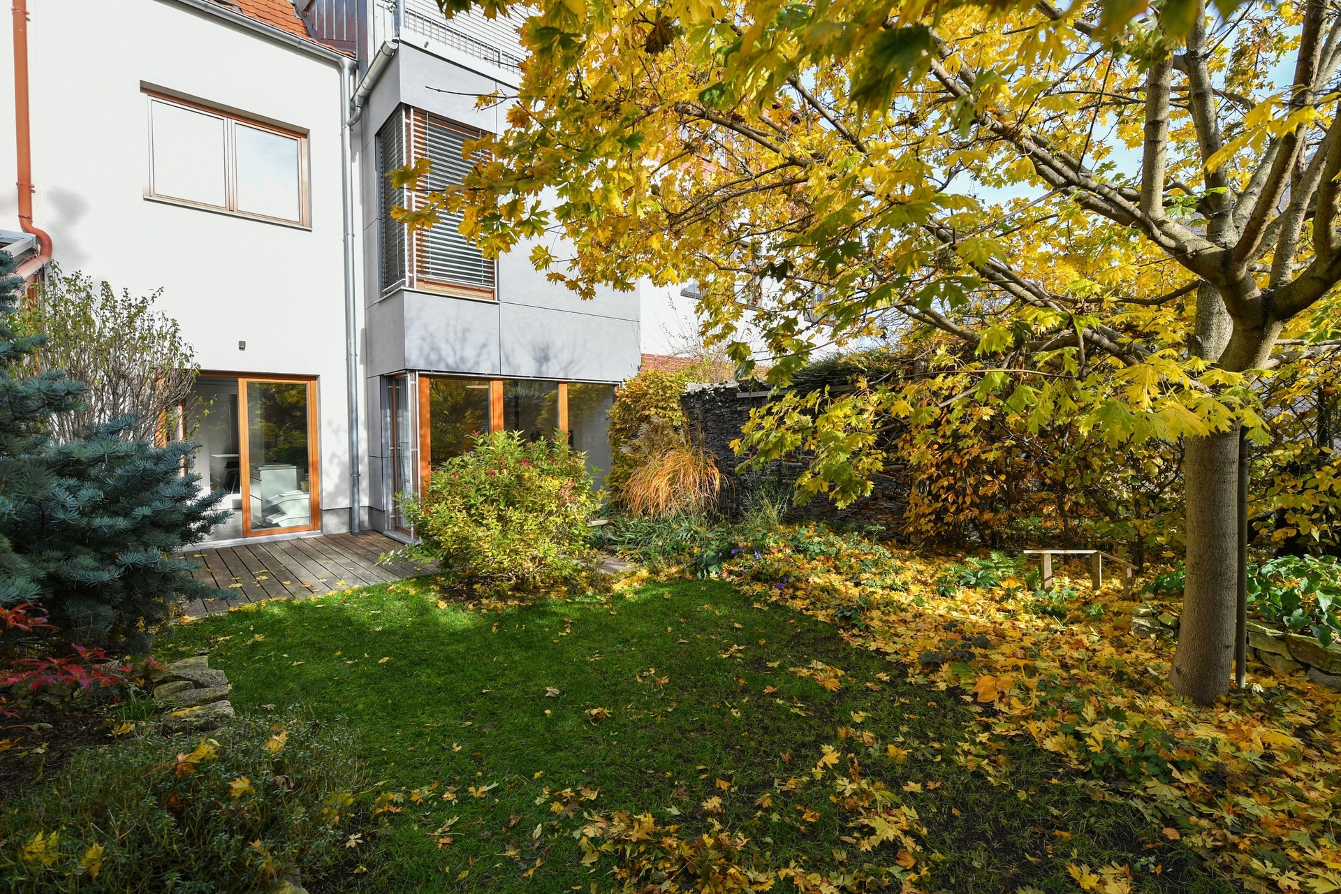 K domu náleží terasa a menší zahrada orientovaná do klidné části za domem, která poskytuje dostatek soukromí i přes centrální polohu domu. Parkování je možné v rámci modrých zón, jeden vůz je možné zaparkovat přímo před dům v rámci objektu.