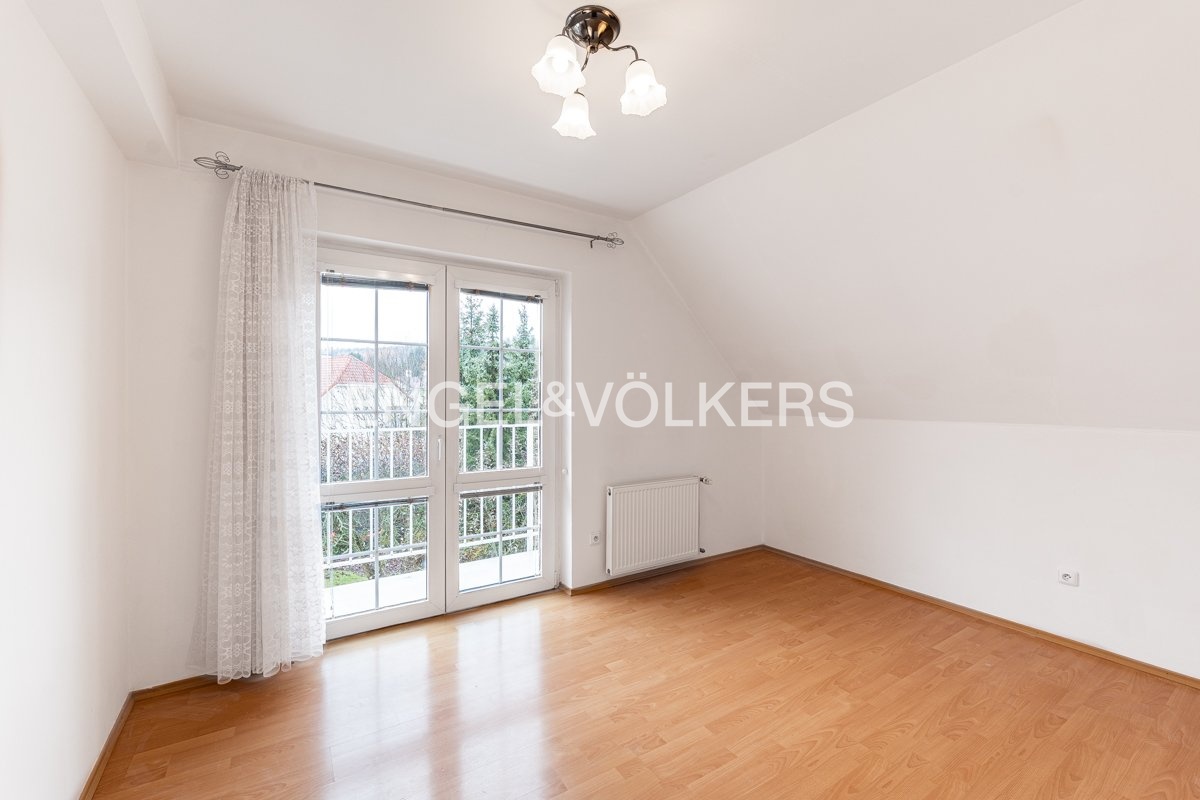 V přízemí najdete velký obývací pokoj s krbem a vstupem na terasu, samostatnou kuchyň, dva další pokoje, koupelnu s vanou i sprchovým koutem a oddělenou toaletu. V patře se nachází pět pokojů, druhá koupelna, pračka se sušičkou a samostatná toaleta. Díky množství oken a balkonů je dům velmi světlý a nabízí příjemné výhledy do okolní zeleně.