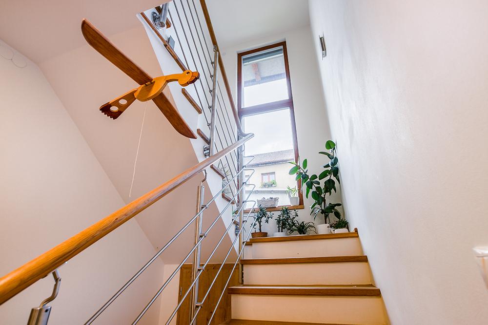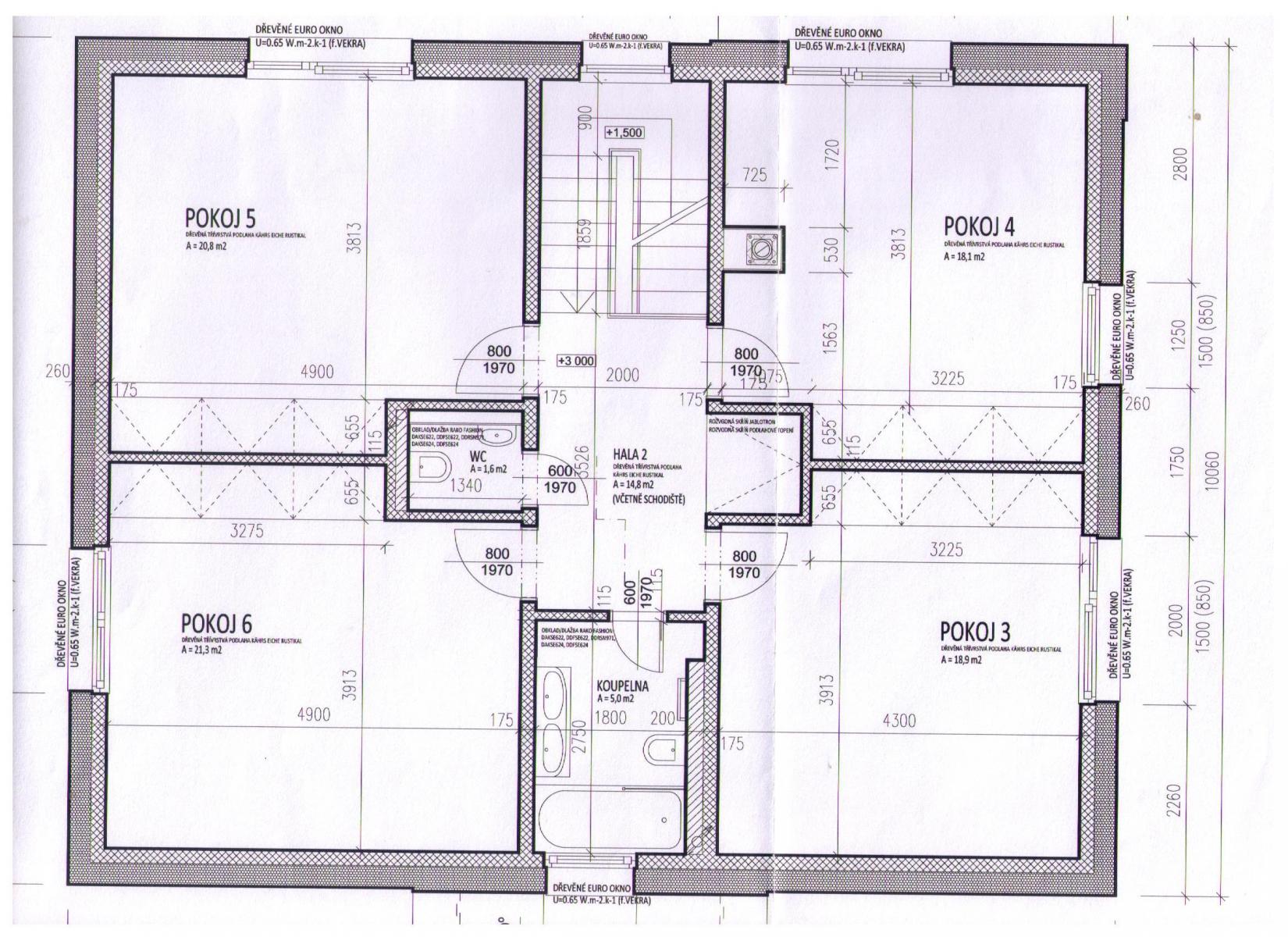 V patře jsou k dispozici čtyři samostatné pokoje (každý s vestavěnými skříněmi), koupelna s vanou, samostatné WC a vstup na půdu s možností dalšího úložného prostoru.