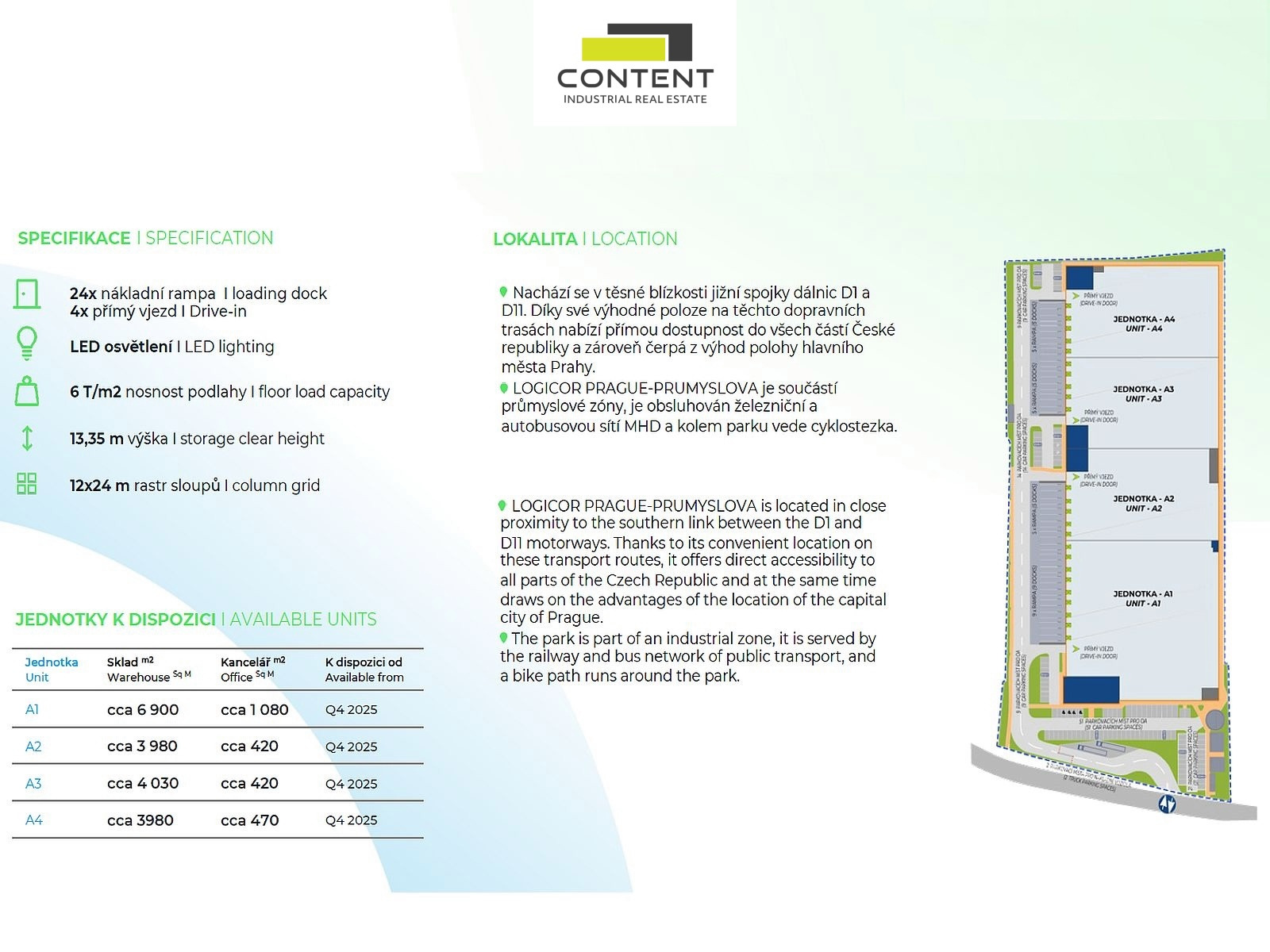 V zastoupení majitele a bez provize nabízíme novostavbu komerčních prostor umístěných v rámci nového průmyslového areálu situovaného u Průmyslové ulice. Výjimečná nabídka moderních skladových nebo výrobních prostor v rámci širší Prahy, ideální pro zásobování města s výborným napojením u Jižní spojky na D1 a D11, D10.