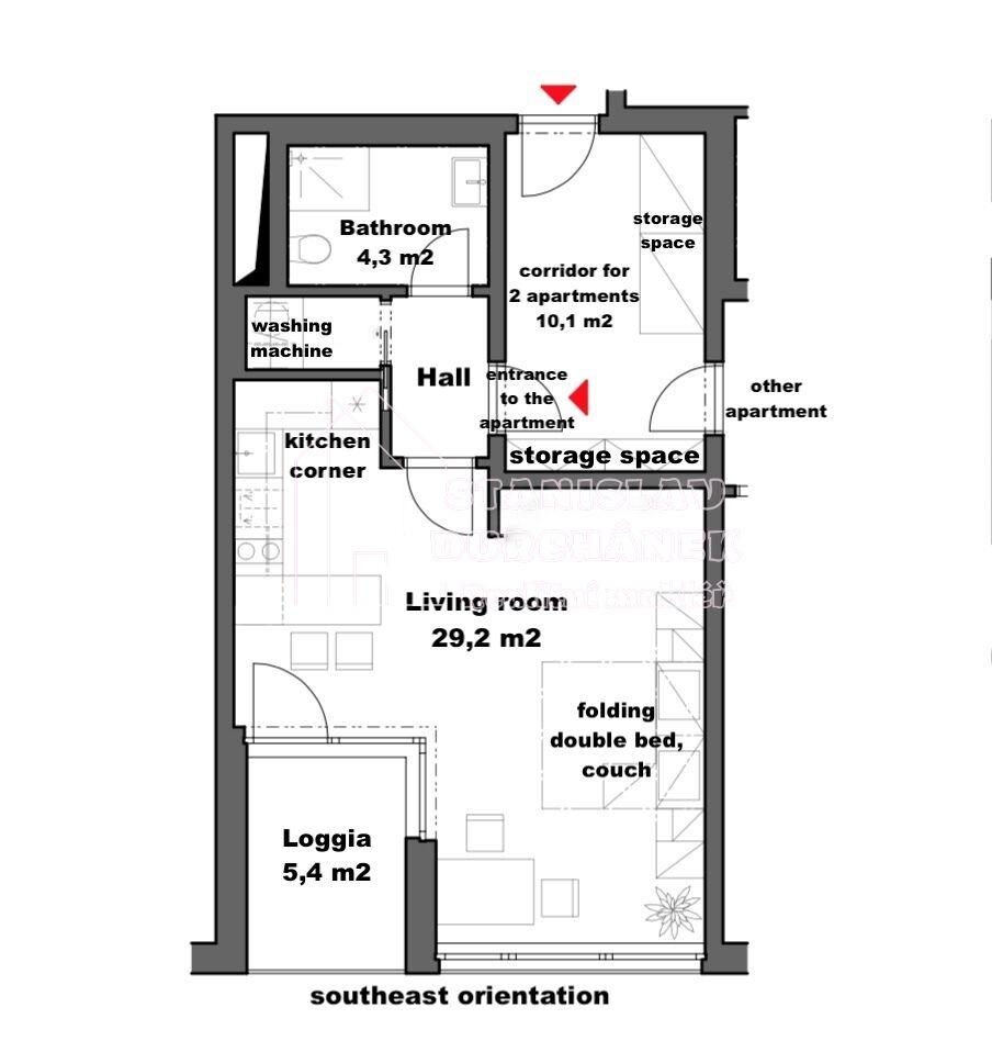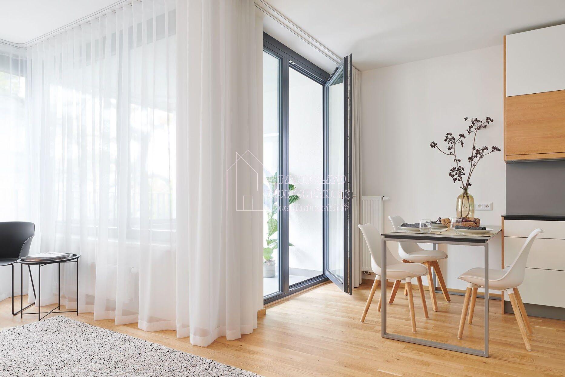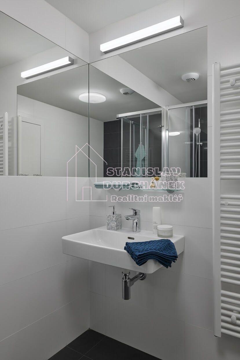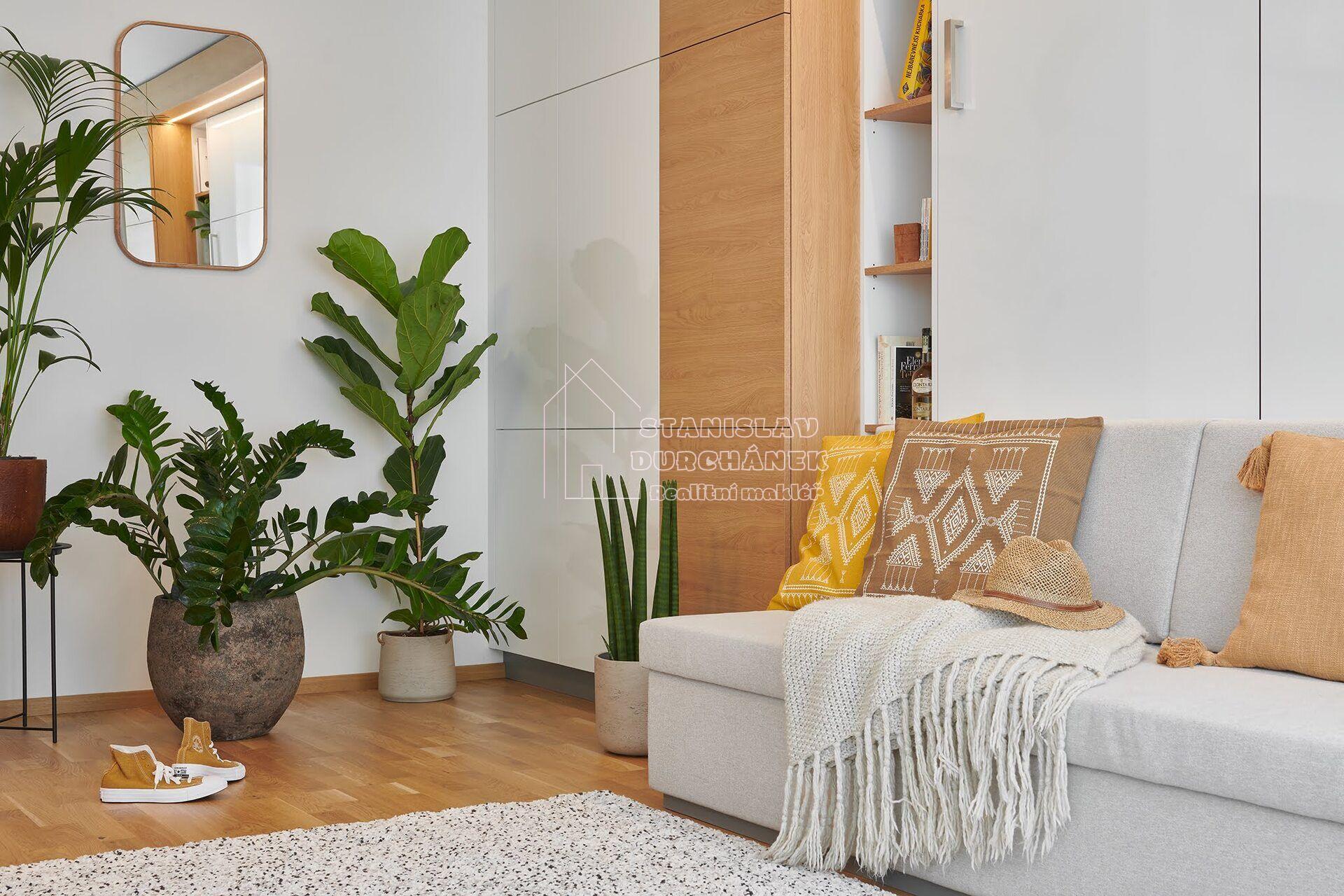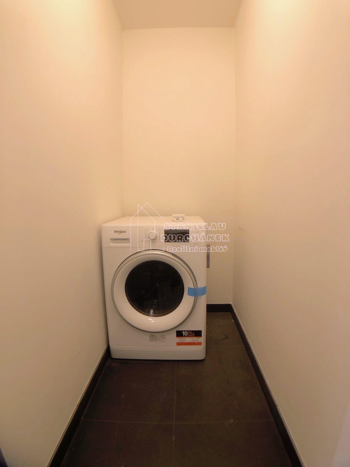 Byt bude pronajímán jako vybavený nábytkem i spotřebiči - velká skříňová stěna v obývacím pokoji, pohovka s úložným prostorem, sklopná dvojpostel (200 x 180 cm) se zdravotní matrací, stůl, židle, v kuchyni pak rohová kuchyňská linka včetně vestavěných spotřebičů (lednička, mrazák, myčka, indukční varná deska, digestoř, mikrovlnná trouba s funkcí grilu). V komoře je poté pračka se sušičkou (v jednom). Koupelna je se sprchovým koutem a WC.