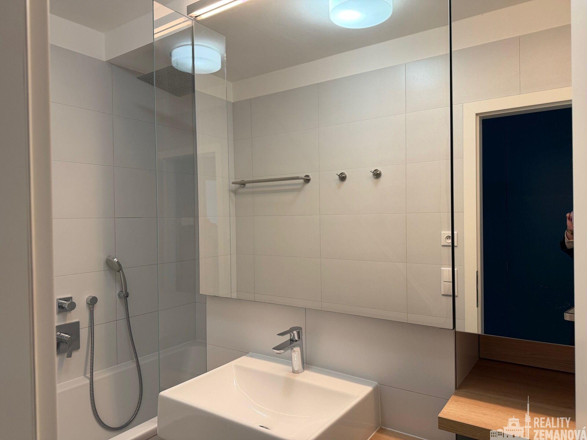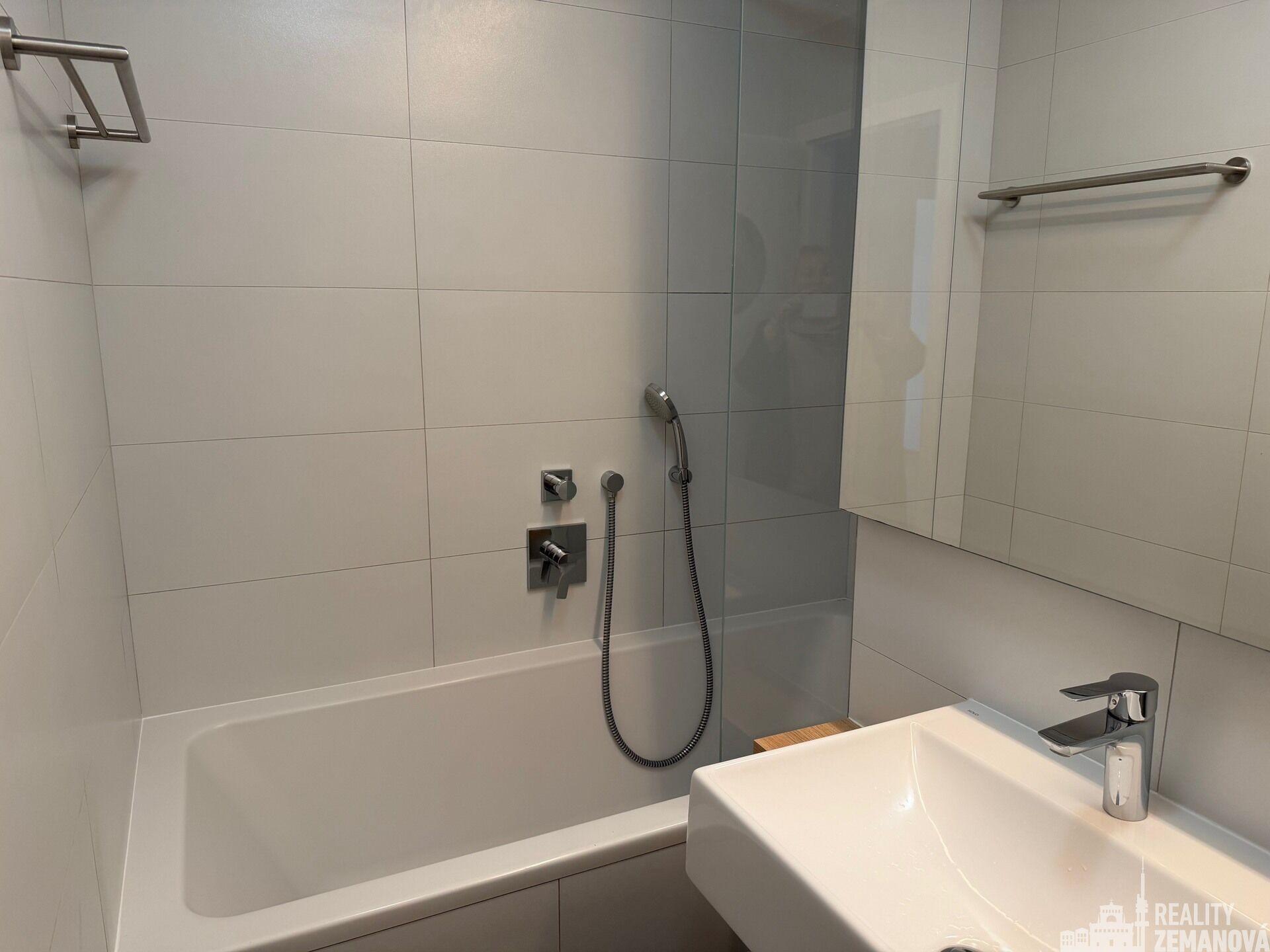 Moderní kuchyně na míru s lakovanou linkou je vybavena kvalitními vestavnými spotřebiči, včetně trouby s pyrolýzou, myčky, lednice s mrazákem a mikrovlnné trouby. Ložnice nabízí nábytek z masivního dubu, který podtrhuje celkový nadčasový charakter bytu. Koupelna je řešena v moderním designu s podomítkovou třícestnou sprchovou baterií.