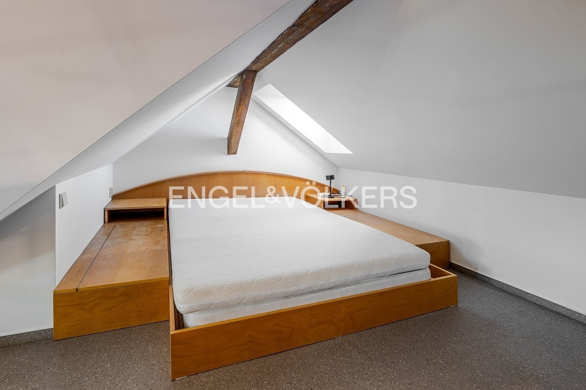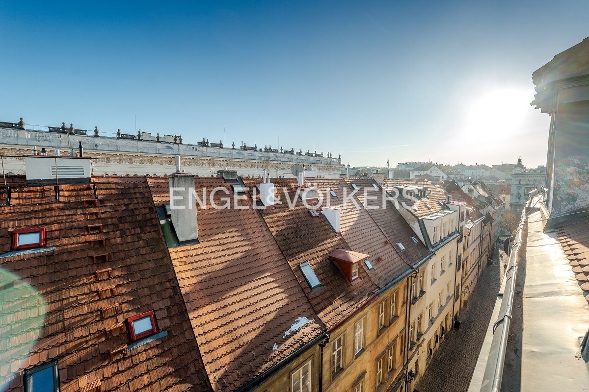 Otevřený obytný prostor, ve kterém je ložnice s vestavěnou manželskou postelí, je propojen s obývacím pokojem odkud je výhled na Staré Město a na Pražský hrad.
