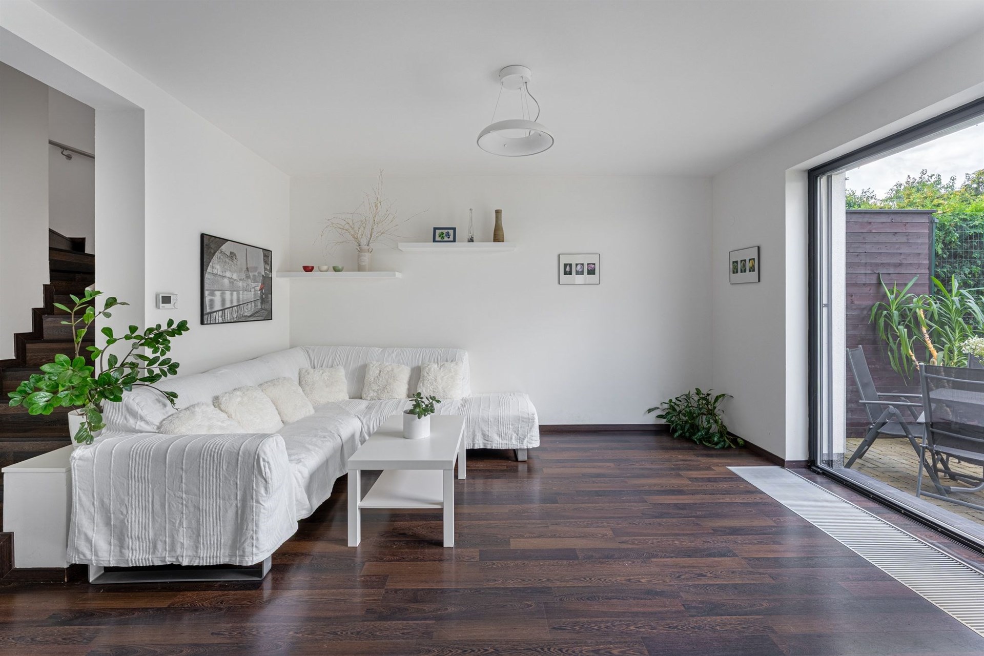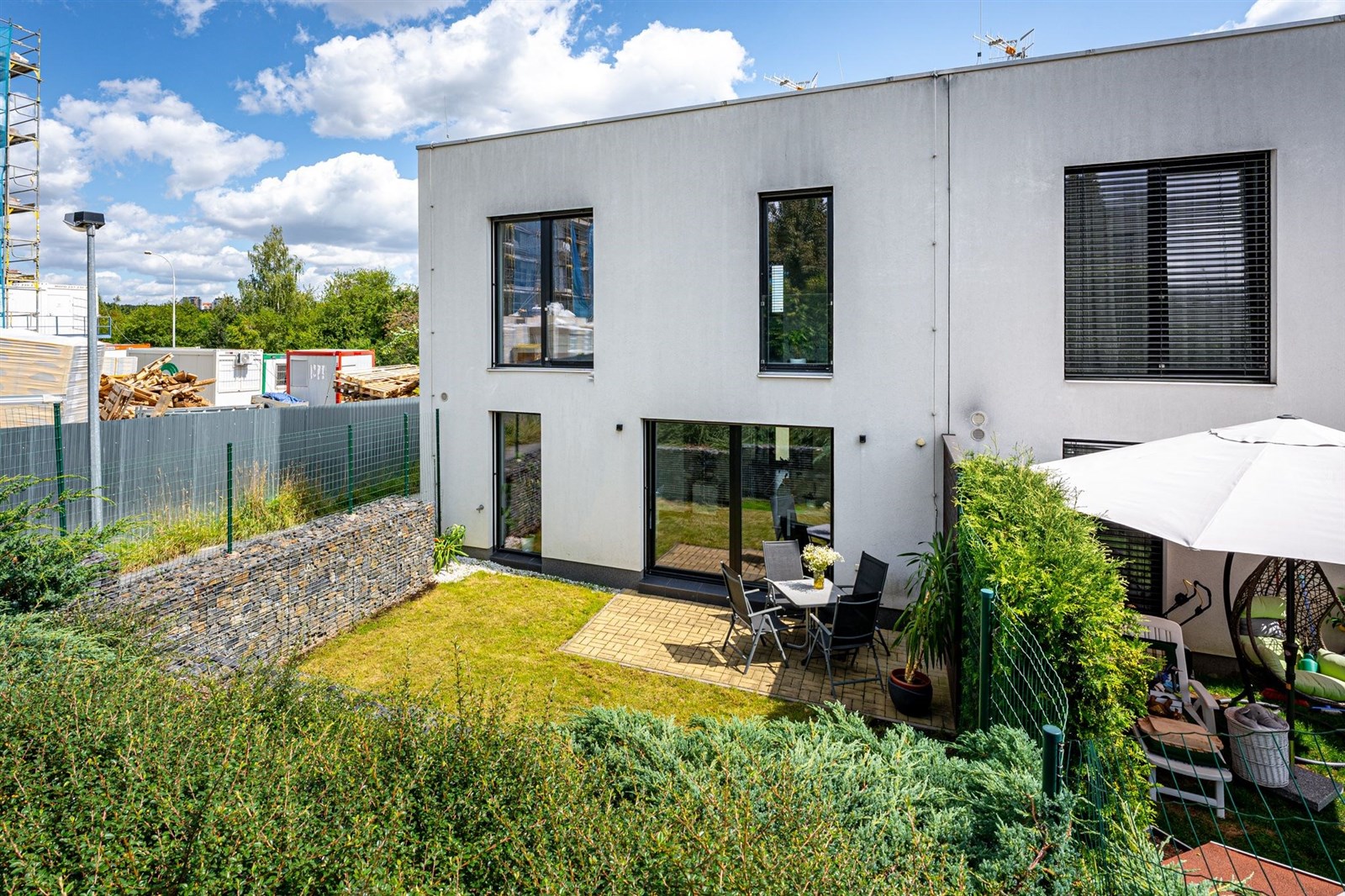 Kuchyně v elegantní bílé barvě je vybavena moderními vestavěnými spotřebiči, včetně lednice, mrazáku, varné desky, digestoře, elektrické trouby, mikrovlnné trouby a myčky. Dům je dále vybaven centrálním vysavačem venkovními žaluziemi s elektrickým pohonem, které zajišťují maximální komfort a úsporu energie. Podlahy jsou laminátové ve všech pokojích, zatímco v kuchyni, koupelnách a na chodbě najdete černou dlažbu.