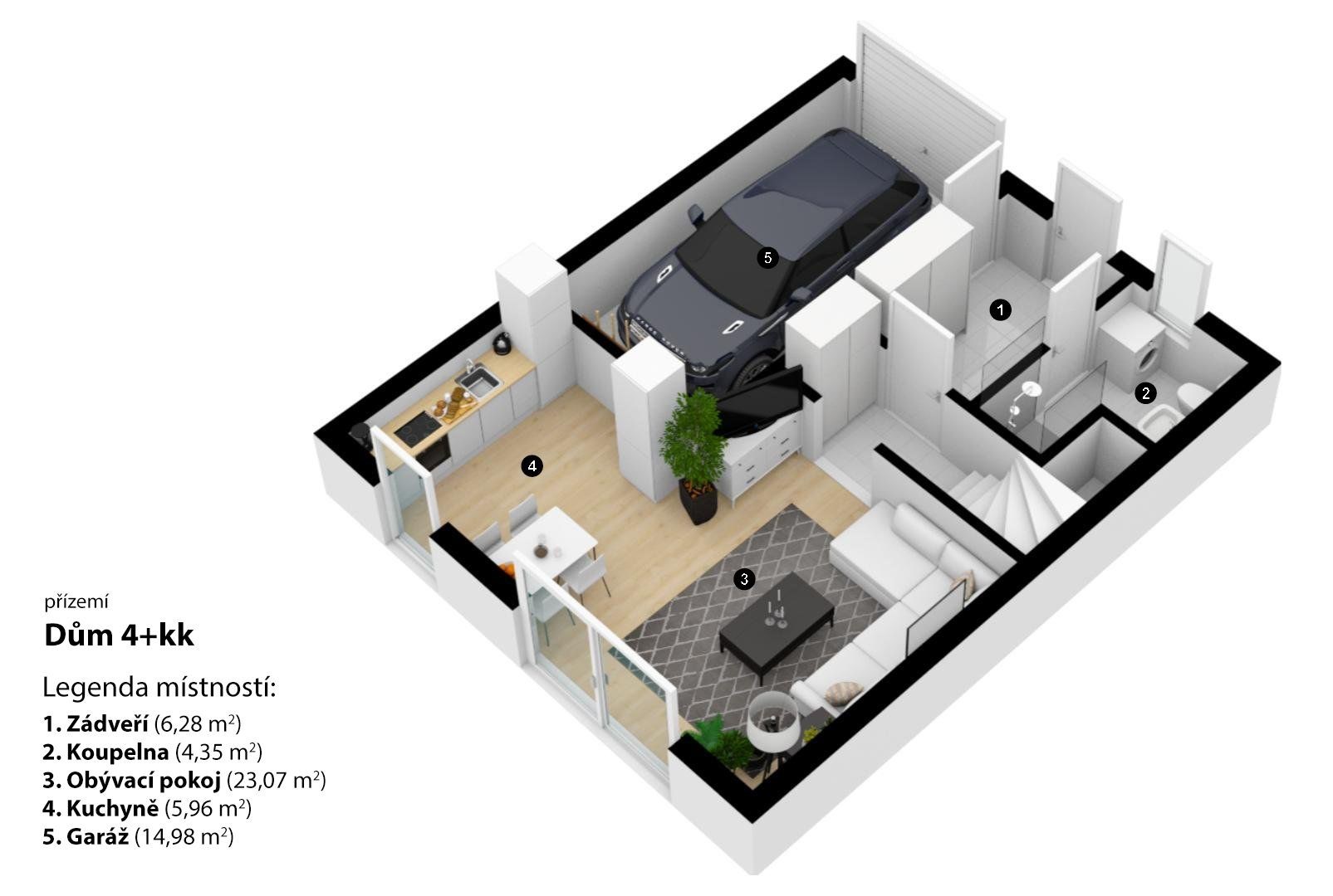 Kuchyně v elegantní bílé barvě je vybavena moderními vestavěnými spotřebiči, včetně lednice, mrazáku, varné desky, digestoře, elektrické trouby, mikrovlnné trouby a myčky. Dům je dále vybaven centrálním vysavačem a venkovními žaluziemi s elektrickým pohonem, které zajišťují maximální komfort a úsporu energie. Podlahy jsou laminátové ve všech pokojích, zatímco v kuchyni, koupelnách a na chodbě najdete černou dlažbu.