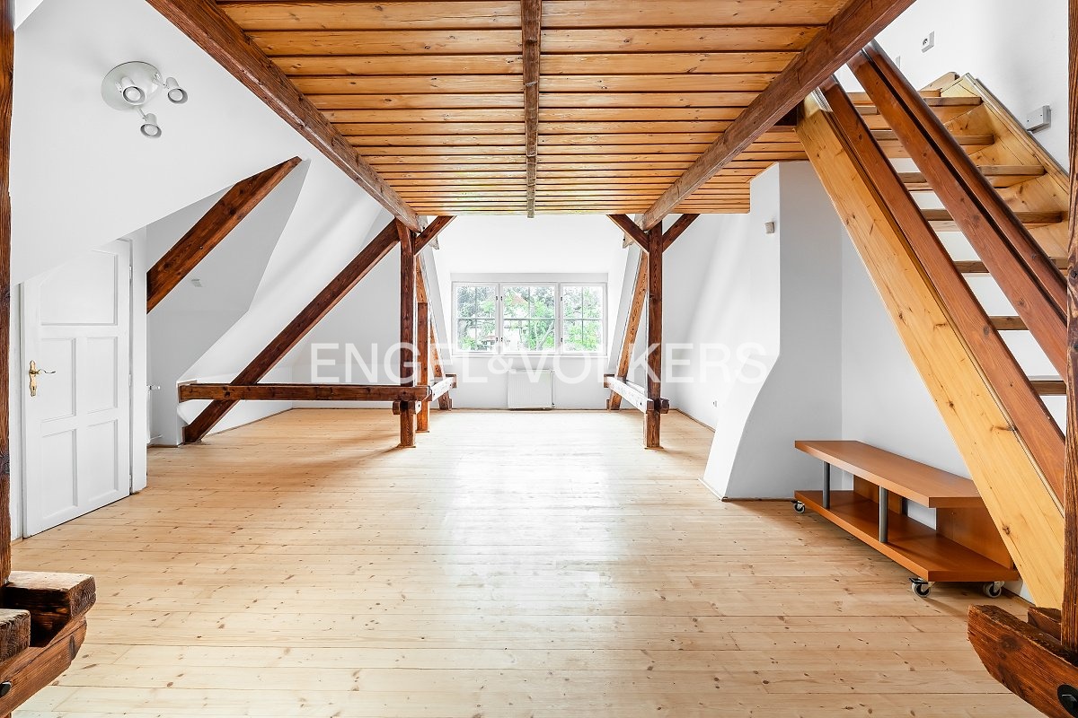 V podkroví se nachází koupelna a otevřený prostor s galerií, ideální jako ateliér, pracovna, knihovna nebo relaxační zóna. Atmosféru dotváří původní dřevěné trámy. Možnost instalace klimatizace dle domluvy.