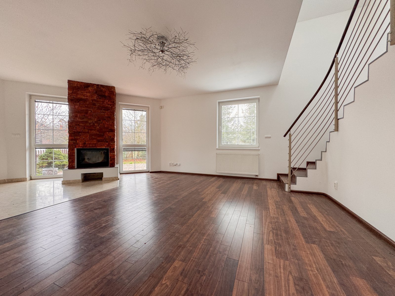 • přízemí: světlá vstupní chodba s přímým vstupem do garáže, prostorný obývací pokoj s krbem a kuchyňským koutem (cca 41 m²) se vstupem na terasu a zahradu, plně vybavená kuchyně (myčka, trouba, varná deska, mikrovlnná trouba, digestoř, americká lednice, dřez), koupelna s vanou, samostatné WC, vstup do sklepa a garáže