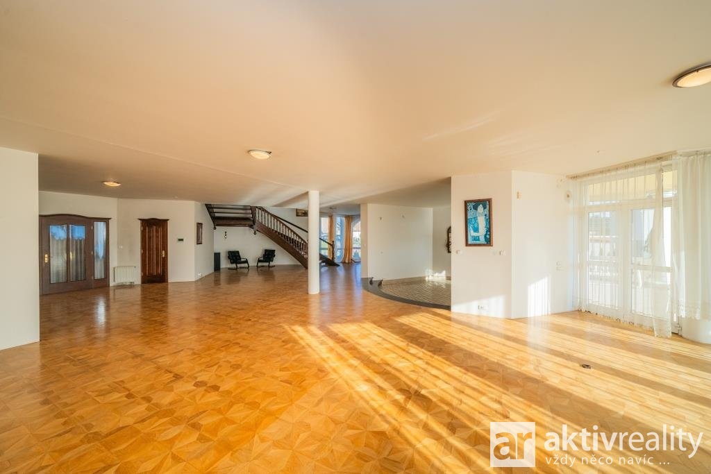 Suterén (343 m²): Zde je velký prosklený bazén s protiproudem, vířivka pro 6 osob, sauna, tělocvična, prádelna a technické zázemí.