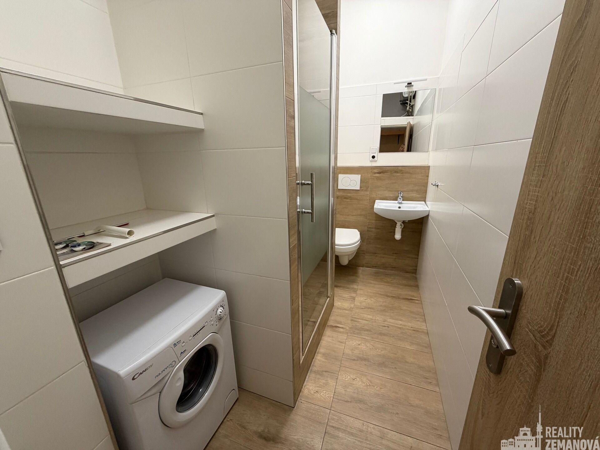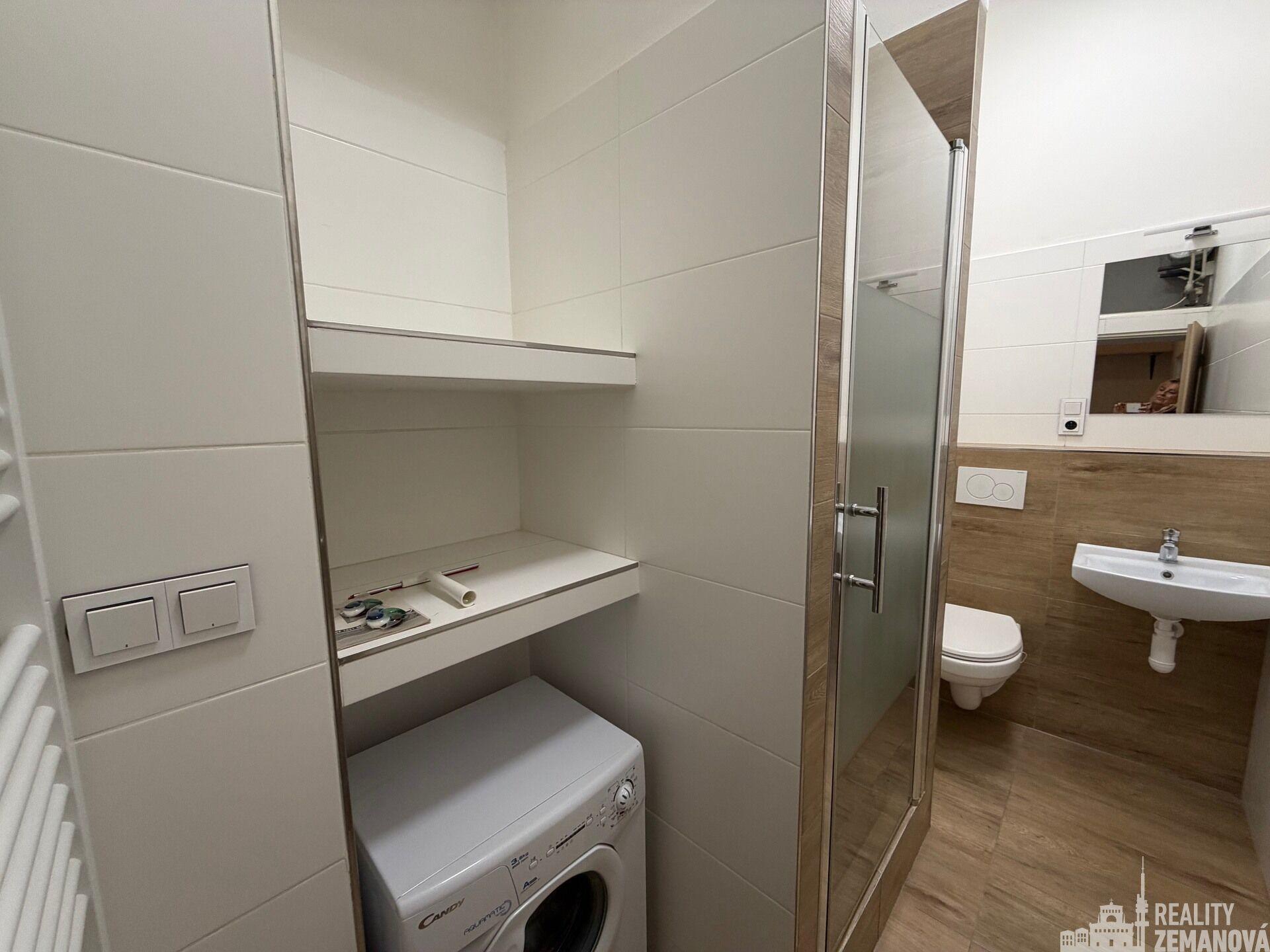 Koupelna je vybavena sprchovým koutem, WC, otopným žebříkem a vyhřívanou podlahou, k dispozici je také automatická pračka.