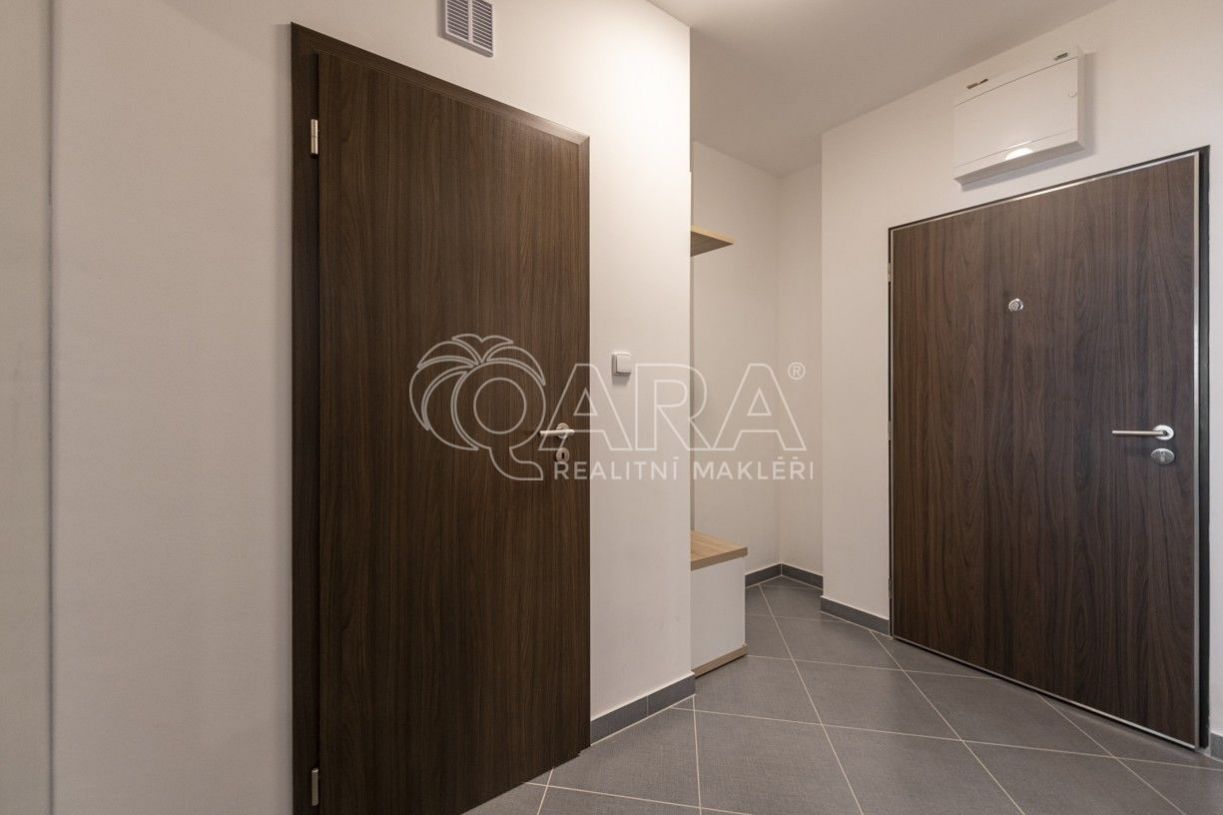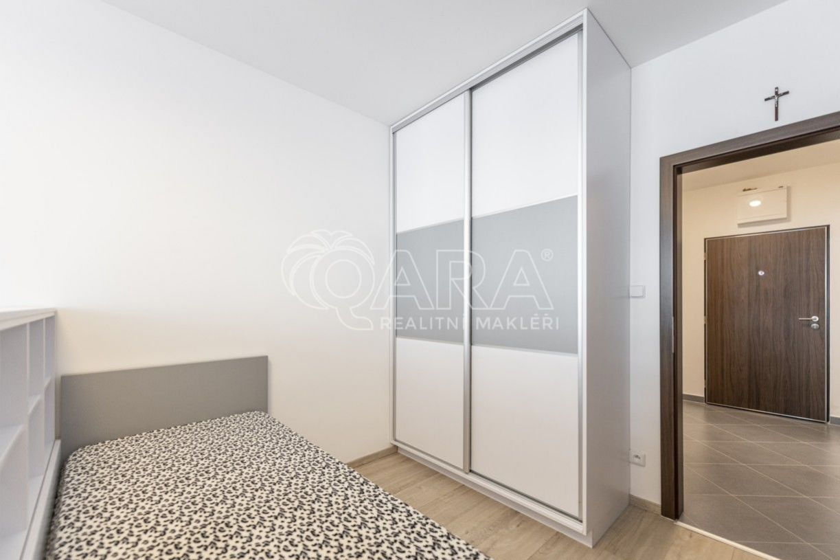Byt je vybavený klimatizací a nábytkem, který vidíte na fotografiích. Nabízí velký obývací pokoj s balkonem 5,8m2 a s kuchyňským koutem s kvalitními spotřebiči. V samostatné ložnici je vestavěná skříň a manželská postel, částečně oddělená policovou zástěnou od jednolůžkové postele, takže se v pokoji kvalitně vyspí tři lidé. V koupelně je pračka, vana a toaleta. Z předsíně je vstup do všech místností a do komory s regálem. Vstupní dveře jsou bezpečností, podlahy jsou plovoucí. V domě je kamerový systém a k dispozici kolárna a kočárkárna. Energetická náročnost je třídy B velmi úsporná.