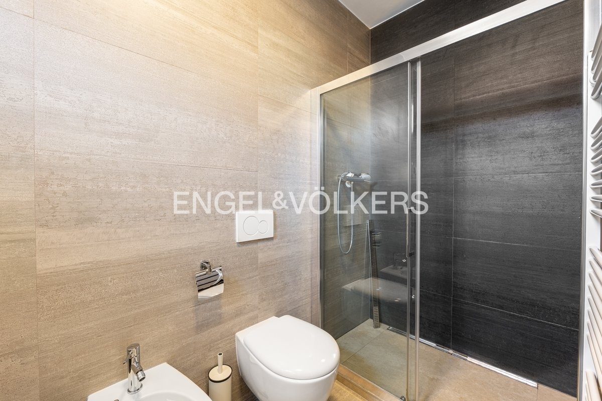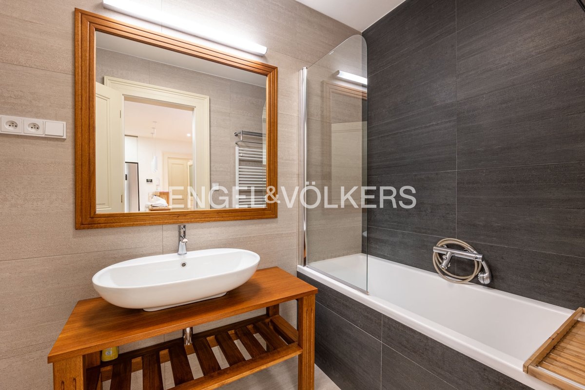 Interiér tvoří vstupní předsíň s vestavěnými skříněmi, prostorný obývací pokoj propojený s plně vybavenou kuchyňskou linkou (indukční varná deska, trouba, lednice s mrazákem, myčka, mikrovlnná trouba) a dvě samostatné ložnice. Jedna z ložnic má vlastní en-suite koupelnu se sprchovým koutem, toaletou a bidetem; druhá koupelna, přístupná z chodby, je vybavena vanou, toaletou a bidetem. Součástí bytu je také technická místnost s pračkou, sušičkou a plynovým kotlem. Obývací pokoj je orientovaný do zeleně Sadů Svatopluka Čecha, zatímco ložnice směřují do klidného vnitrobloku.