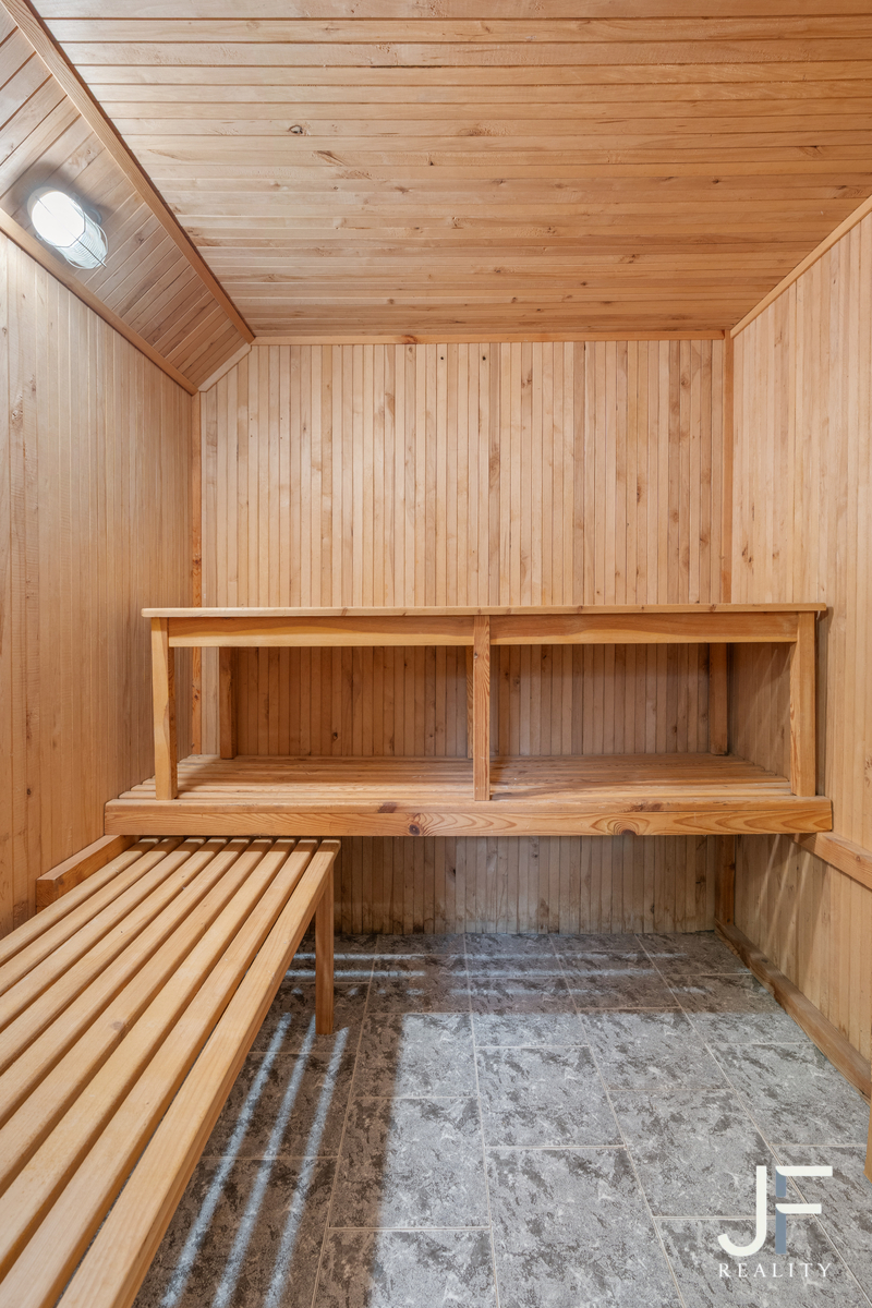 Ze spodního bytu je přímý vstup na zahradu, která navazuje na suterén se zázemím domu – saunou, kuchyní a kotelnou.