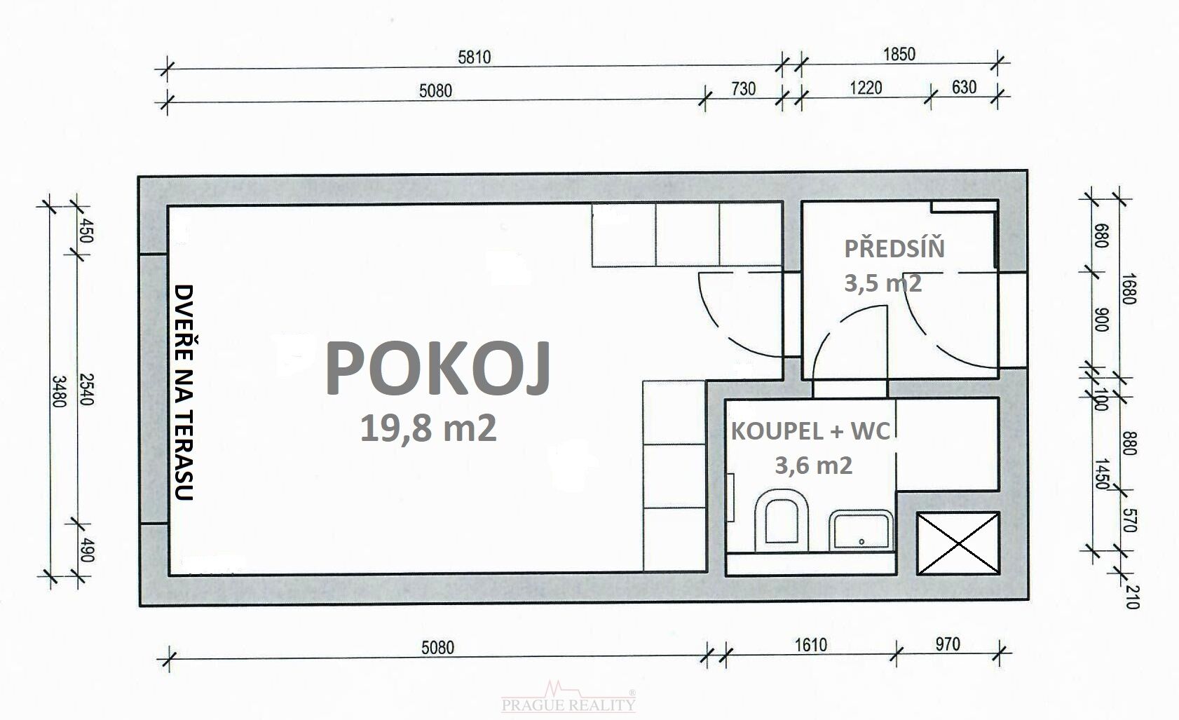 Tento byt má vstupní předsíň, moderní koupelnu s WC a pohodlným sprchovým koutem a s přípojkou pro pračku (případně i sušičku), a dále pokoj s přímým vstupem na úžasnou vlastní, částečně zatravněnou terasu. K bytu dále náleží sklepní kóje.