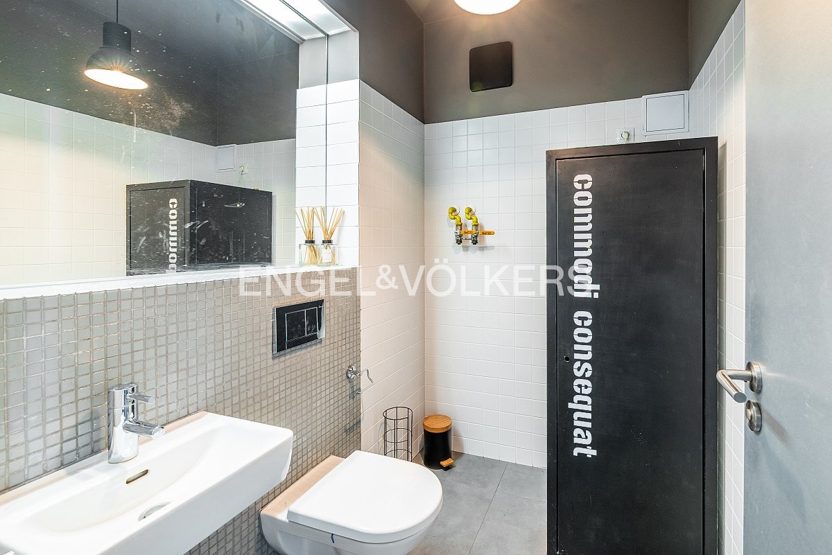 Jedinečný interiér kombinující ultramoderní prvky s prvky industriálního dědictví a 8 m vysokým stropem. Součástí bytu je bar s původními sedačkami pražské tramvaje Tatra T3 z počátku 60. let. Velká okna orientovaná na jih do klidného kancelářského/obchodního parku lemovaného stromy přímo v srdci nově navržené pražské umělecké čtvrti. Celková plocha 146 m2 je dispozičně rozvržena do tří podlaží.