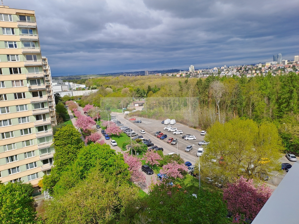 Okna míří na západ – večerní zapadající slunce, panorama Pankráce a Budějovické a klid vysoko nad ulicí. Osmé patro a otevřený výhled do dáli přes velká okna dodávají bytu pocit prostoru, který si lze z uvedené podlahové plochy jen těžko představit.
