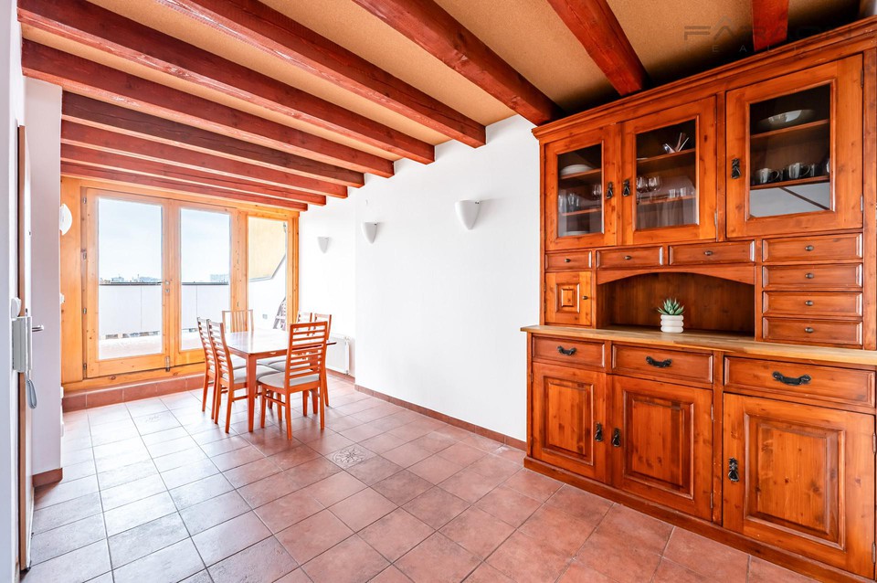 Byt se pronajímá zařízený, viz. foto. Kuchyně je vybavena nádobím a všemi spotřebiči - myčka, sklokeramická deska, trouba, digestoř, lednice. V ložnici je manželská postel, druhý pokoj může sloužit jako ložnice, šatna či pracovna. V bytě je dostatek úložných prostor. Nábytek vyrobený na zakázku, z masivu exotického dřeva, vhodně dotváří atmosféru přiznaných tesaných trámů v interiéru, s dřevěným schodištěm.