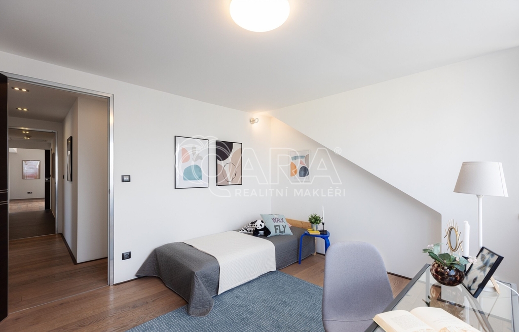 Zapomeňte na stereotypní podkrovní byty s nízkými stropy. Tohle je prostor, kde se můžete nadechnout. Na ploše 146 m² se rozkládá byt, který v sobě snoubí moderní design a praktičnost. Díky výtahu, který vás doveze až do vaší předsíně pomocí čipu, si užijete maximální komfort a soukromí. Pro hosty je k dispozici video telefon a schodiště, které můžete využít pro dodatečný úložný prostor.